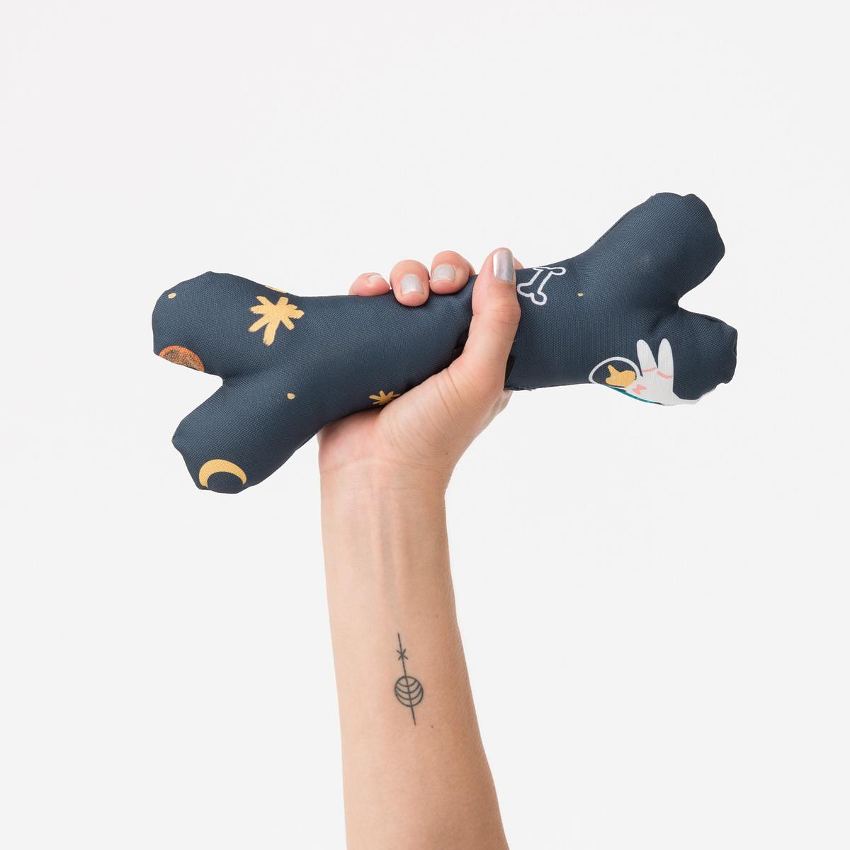 Our bone-shaped toy will please every pooch. The bone is sewn from strong, waterproof material; inside it was filled with soft ovate. An interesting pattern designed by the wonderful illustrator Lina Lark will make every pet happy with such a gift.
