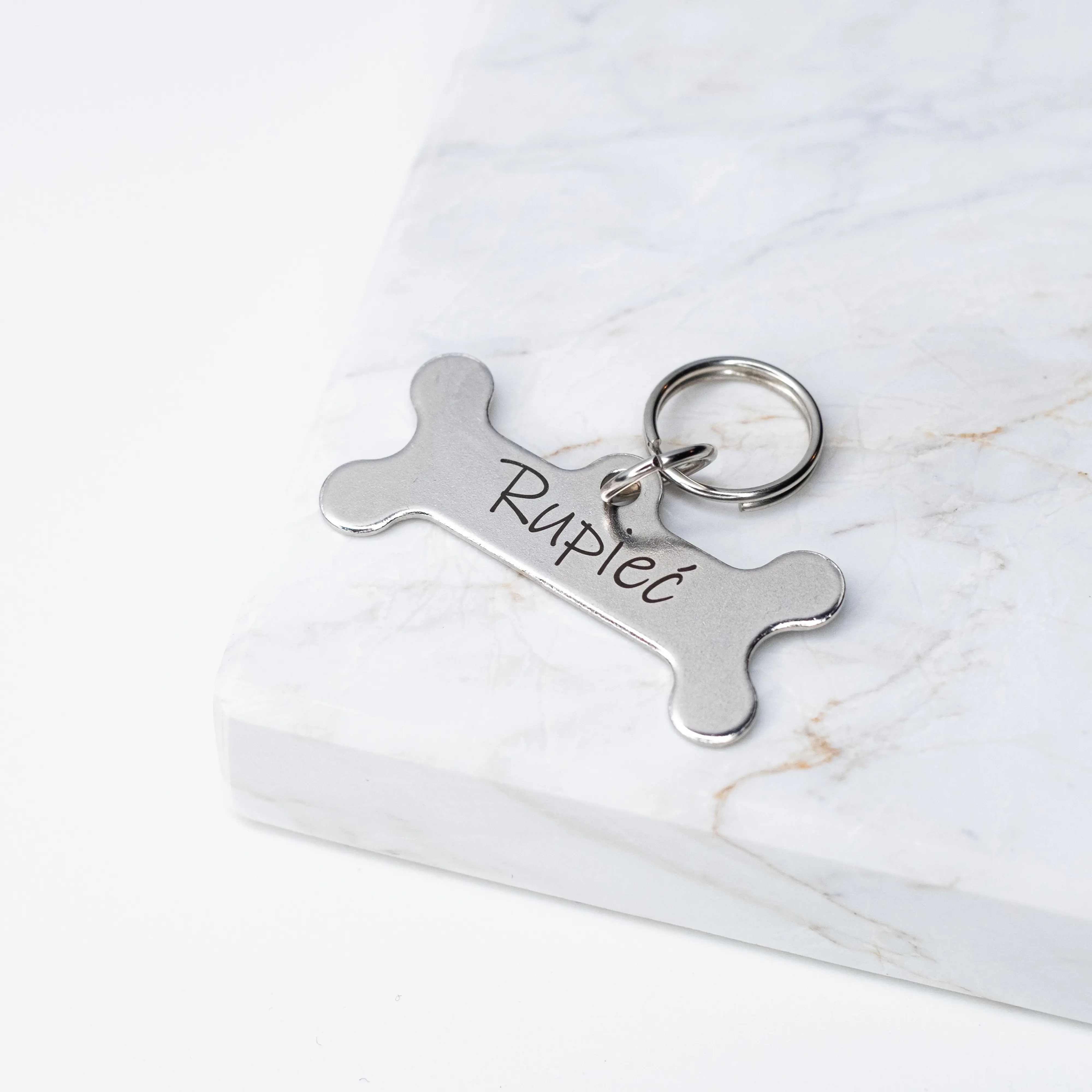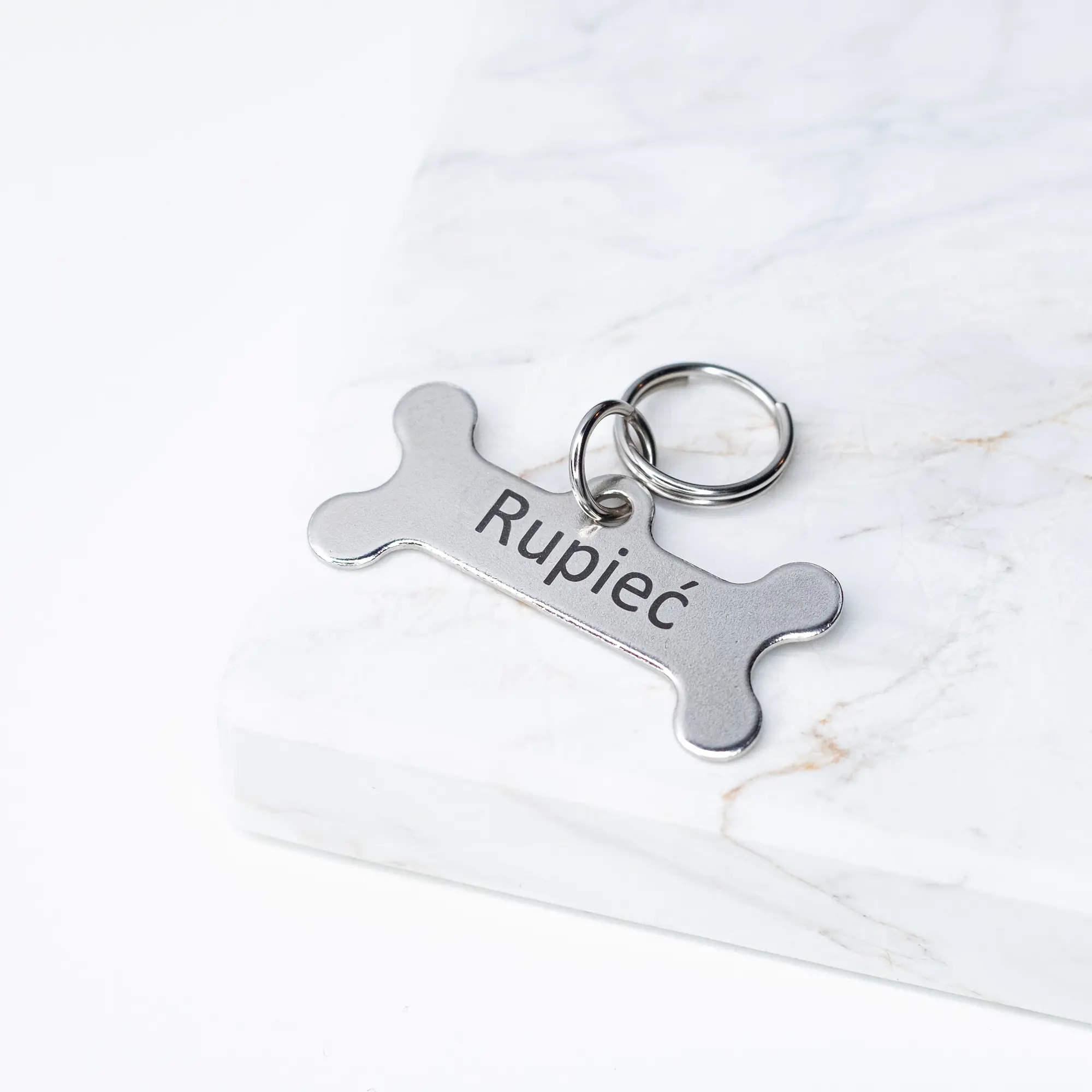 Adresówka ze stali w kolorze srebrnym w kształcie kości 44mm x 26mm.