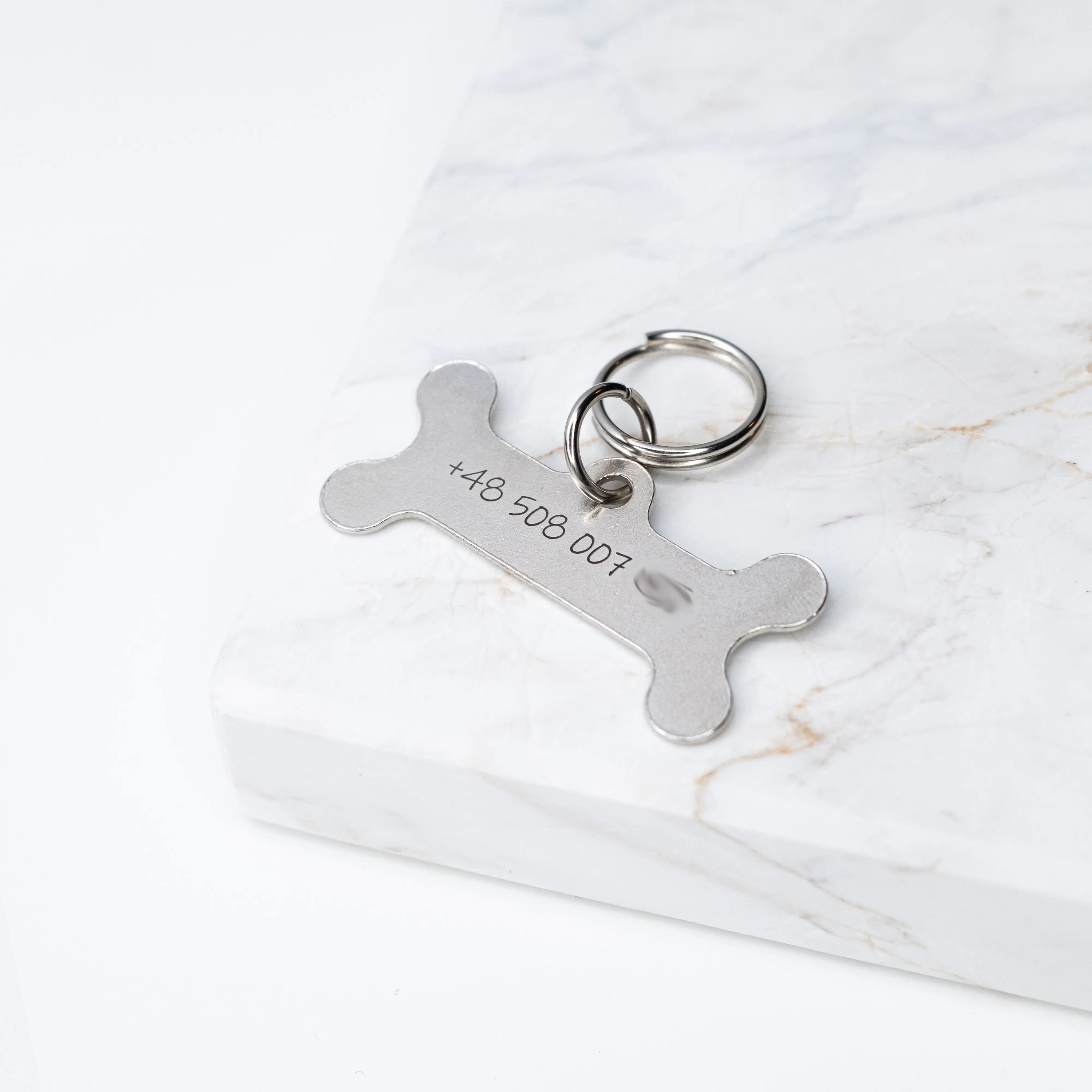 Na adresówce można wykonać grawer z 2 stron. Z jednej strony imię zwierzaka a z drugiej 2 numery telefonu.