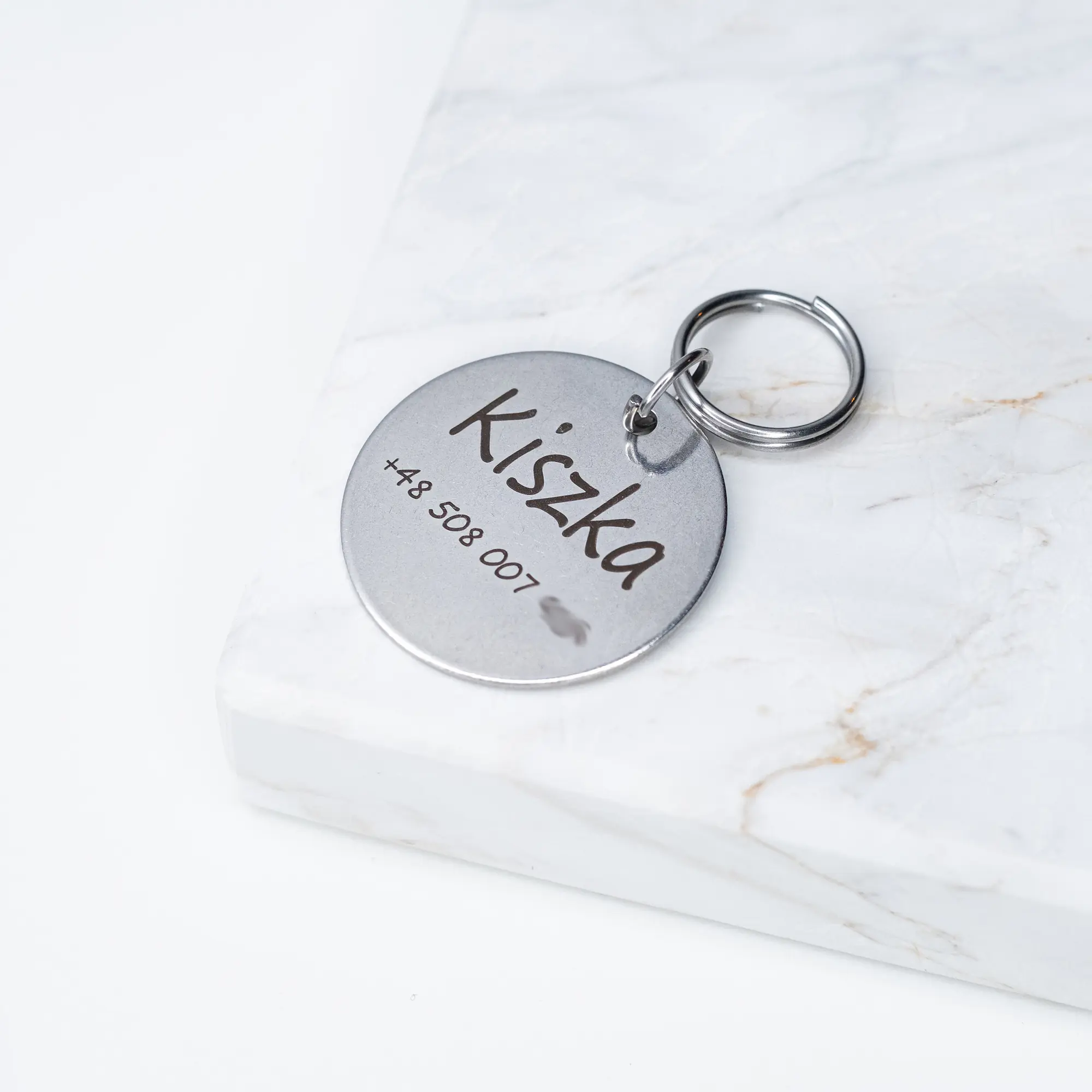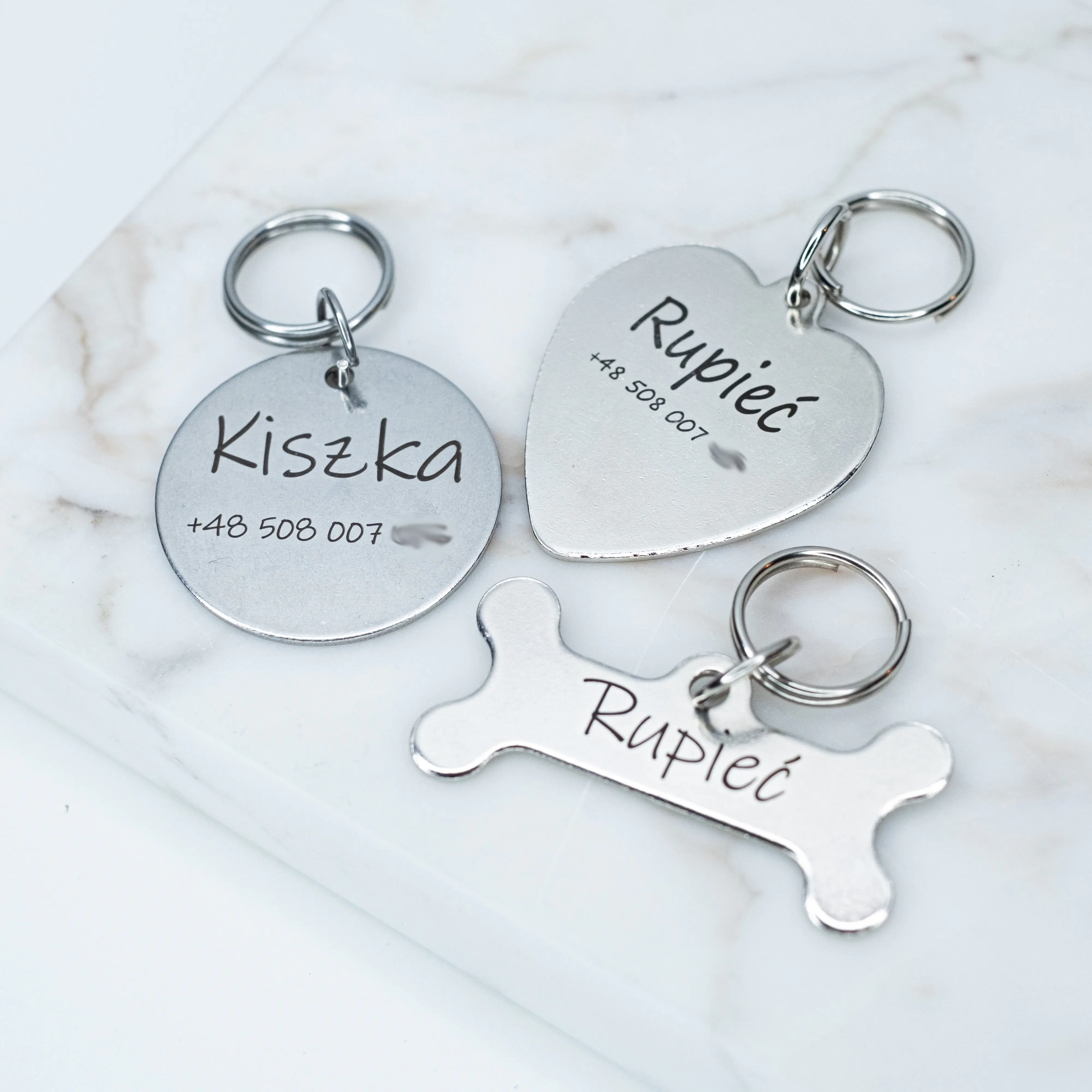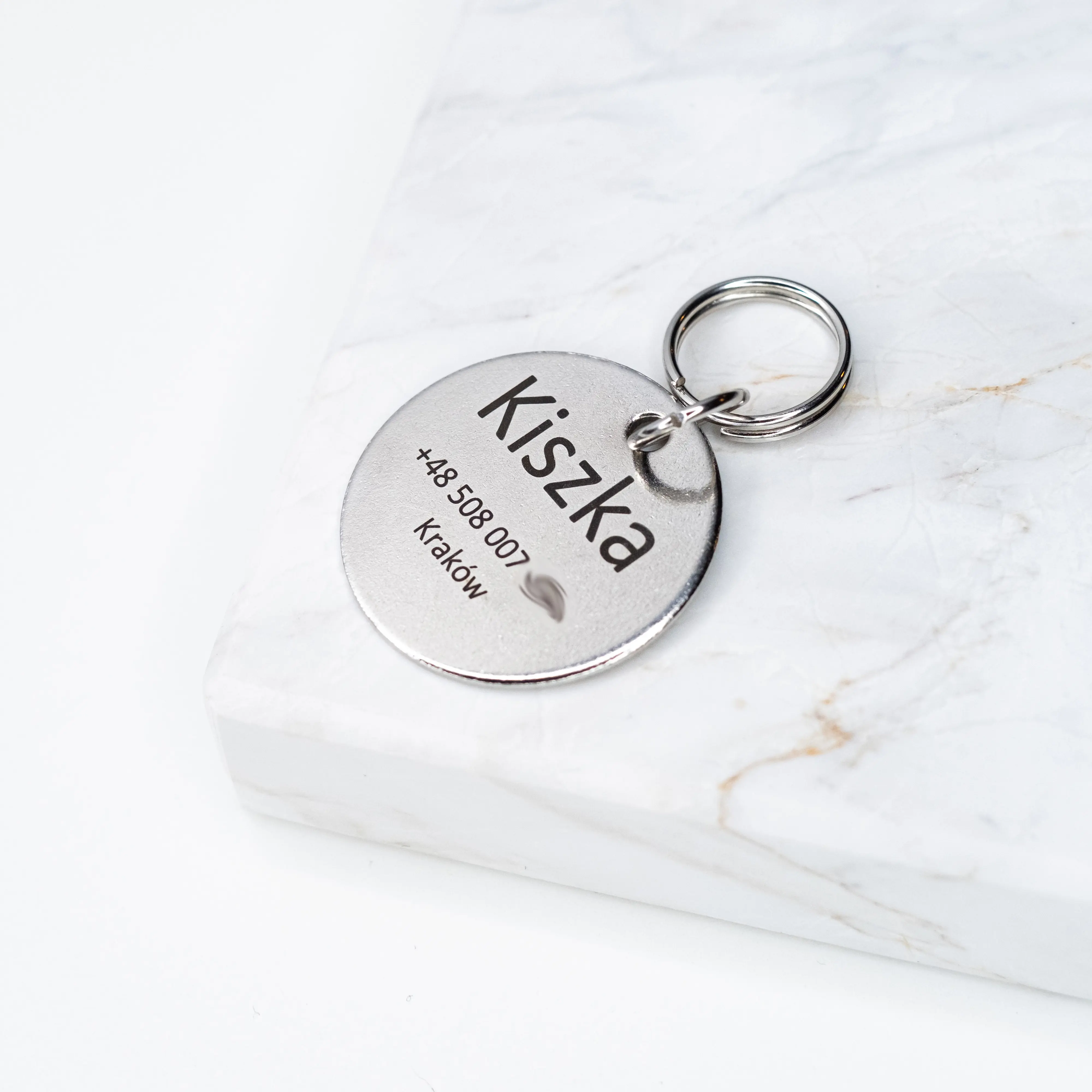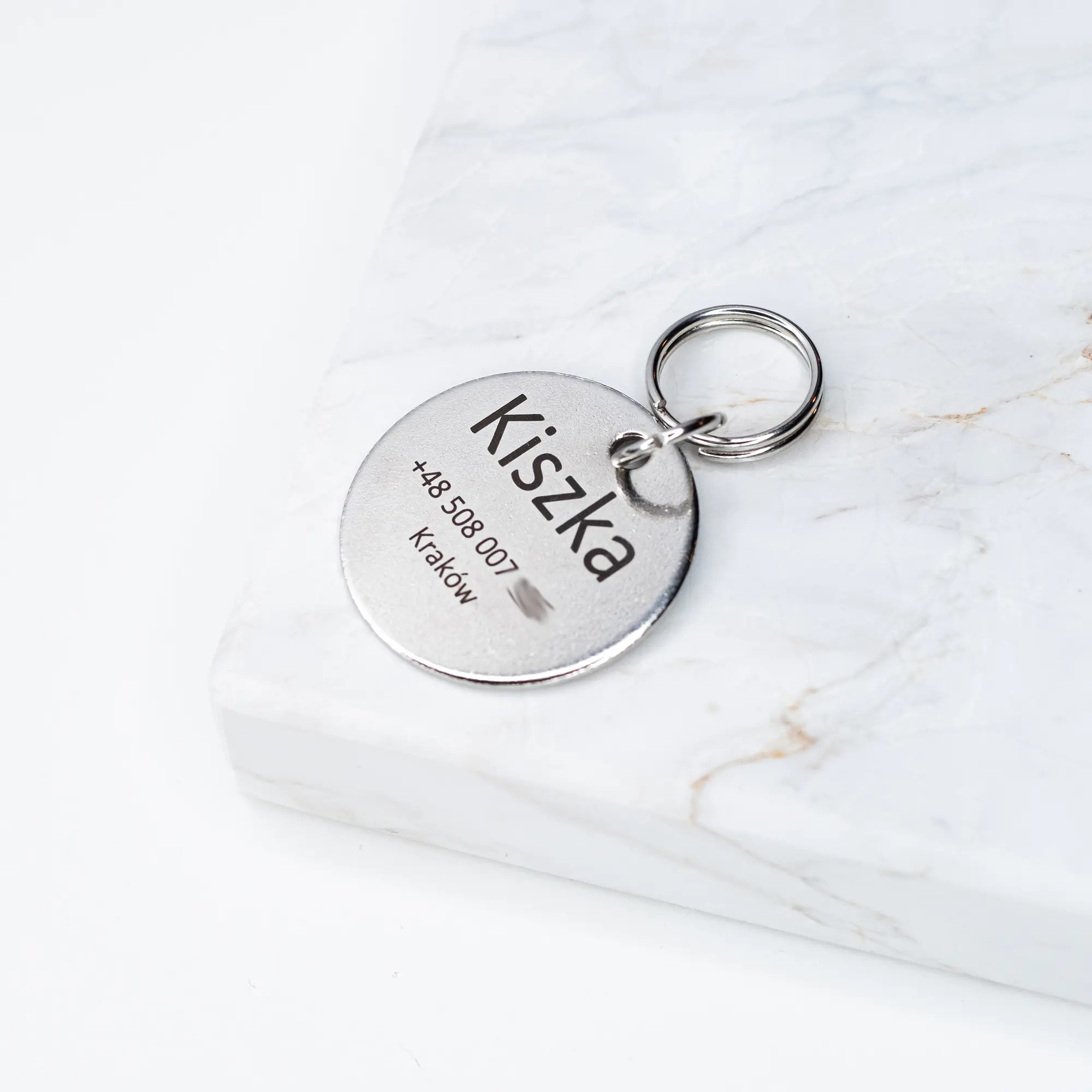Na adresówce można wykonać grawer z 2 stron. Z jednej strony imię zwierzaka i 2 numery telefonu. Z drugiej strony zmieści się pełny adres.