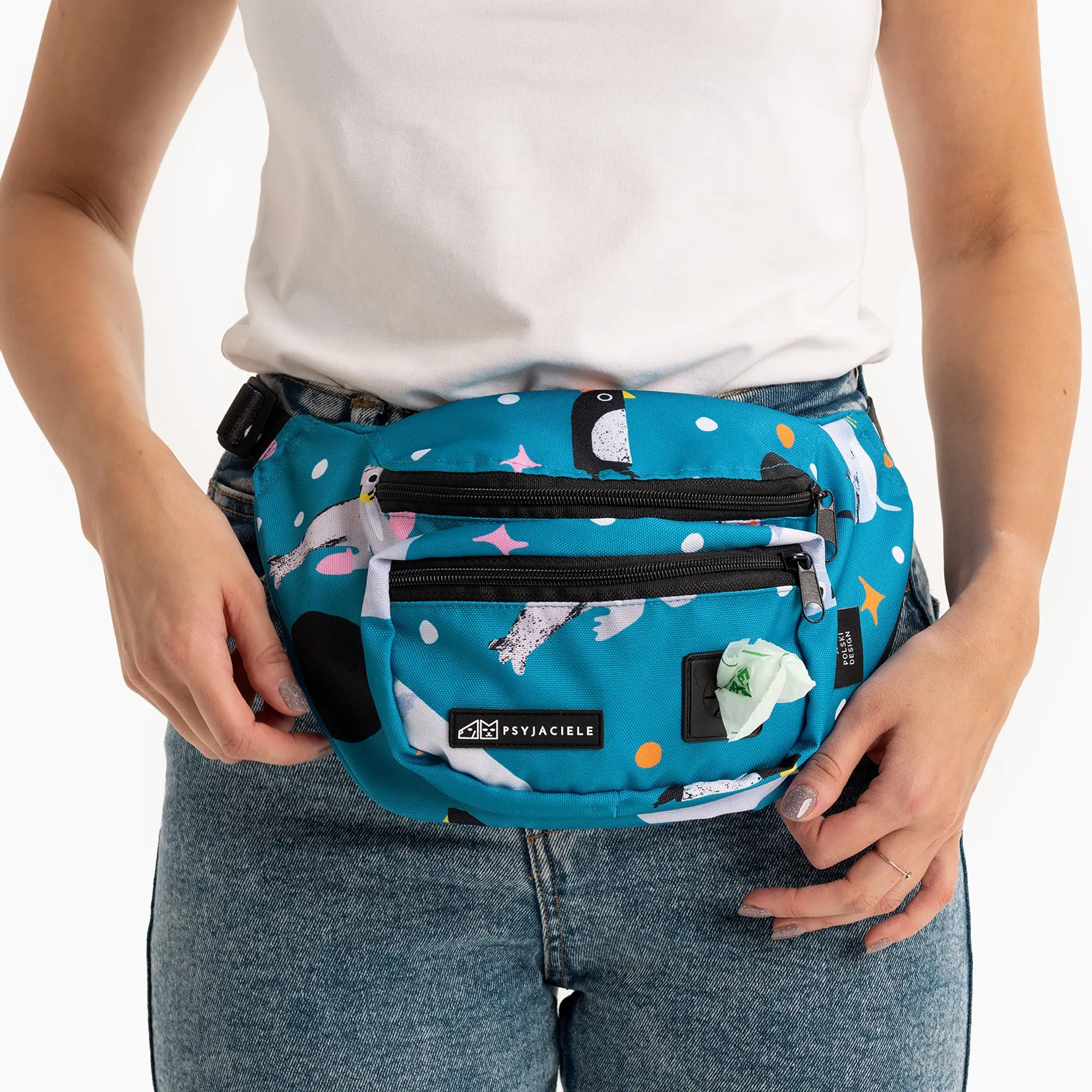 Our kidney bag is not only unique in appearance but also highly functional. The perfect addition to any outfit, it's perfect for a walk with a dog or kitten. Comfortable, adjustable belt, easy zipper opening and a dispenser that allows you to quickly remove dog poop bags or can be used as a pocket for headphones. It will hold everything necessary - wallet, keys, phone, as well as treats and bags for your pet. For even greater functionality, we have placed an additional D ring at the end of the bag, allowing you to attach, for example, a leash and keep your hands free while walking with your pet running loose. The bag is also great for roller skating, cycling or other activities.