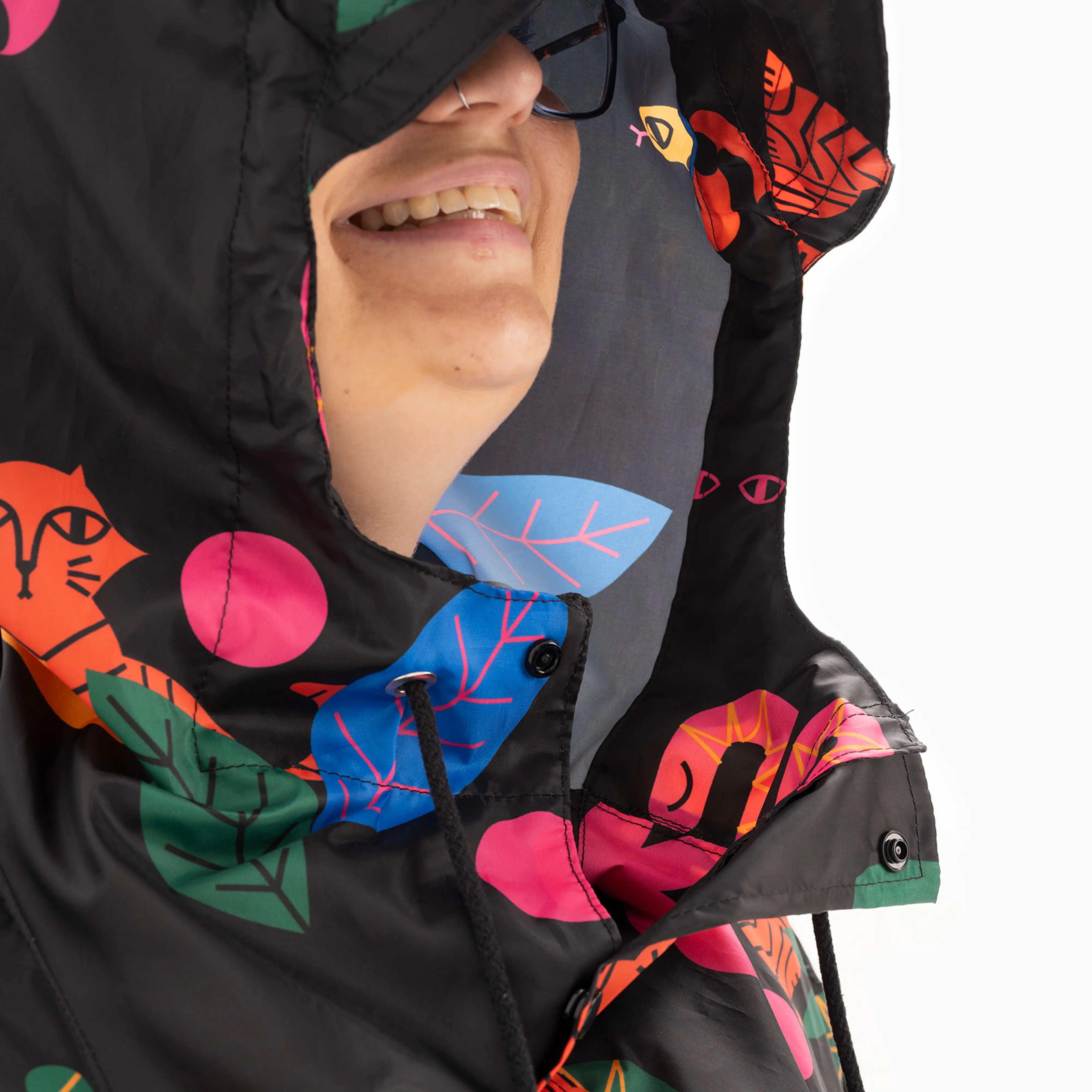 A wonderful mackintosh created and manufactured in Poland from the highest quality waterproof fabric with pattern. It is one size which looks great on both boys and girls. The raincoat can be stowed in the small pocket at the front turning it into a pouch and clipped to your backpack or bag with the attached carabiner.