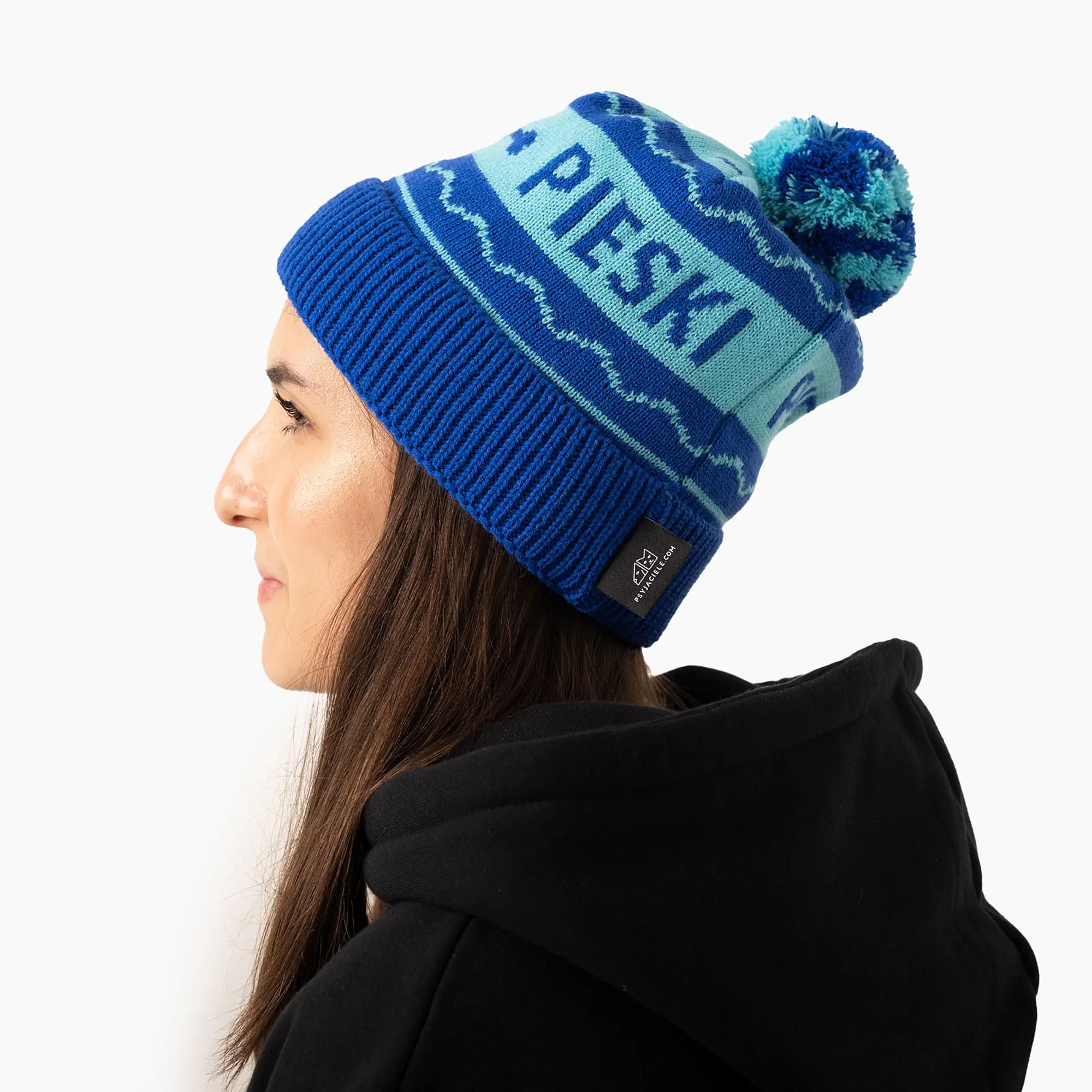 Na środku widnieje napis "Pieski". Z tyłu wszyta nasza metka Psyjaciele.com, wewnątrz Pan tu nie stał. Dwukolorowy pompon można odwiązać.