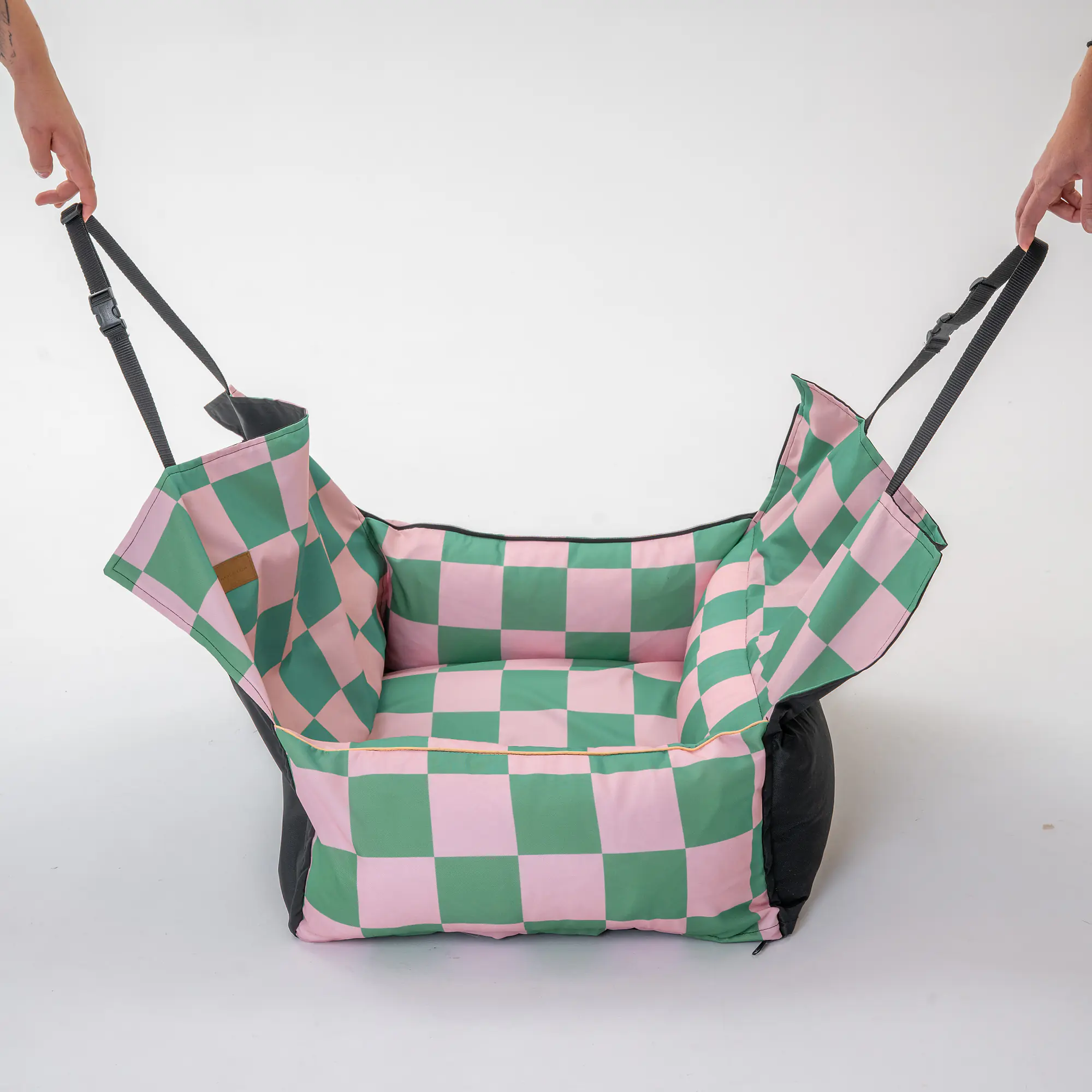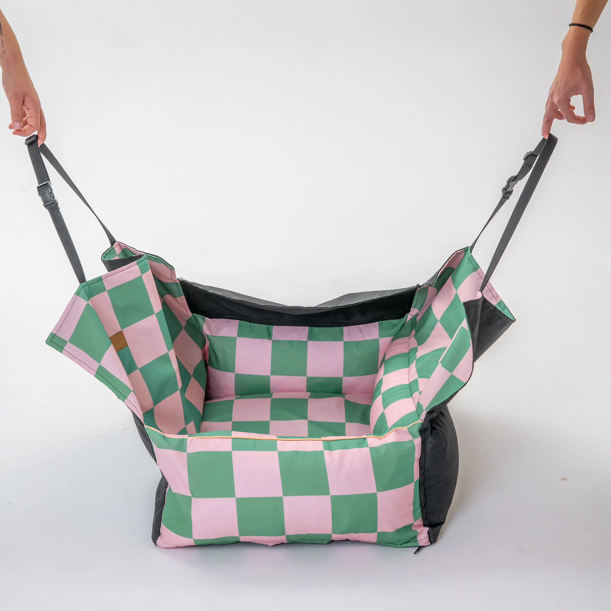 Fotelik podszyty jest materiałem antypoślizgowym, dzięki czemu, że nie zsuwa się z kanapy, nawet gdy pies mocno się kręci podczas podróży. Po lewej stronie znajduje się otwór do przeciągnięcia pasa. Fotelik nie zawiera pasa. Możesz dołożyć pas w pasującym wzorze, jednak wydłuży to czas realizacji do 7 dni roboczych.
