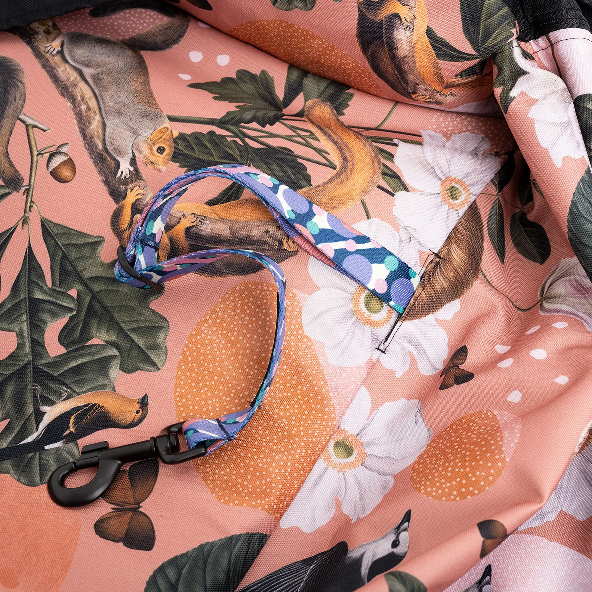 Fotelik podszyty jest materiałem antypoślizgowym, dzięki czemu, że nie zsuwa się z kanapy, nawet gdy pies mocno się kręci podczas podróży. Po lewej stronie znajduje się otwór do przeciągnięcia pasa. Fotelik nie zawiera pasa.