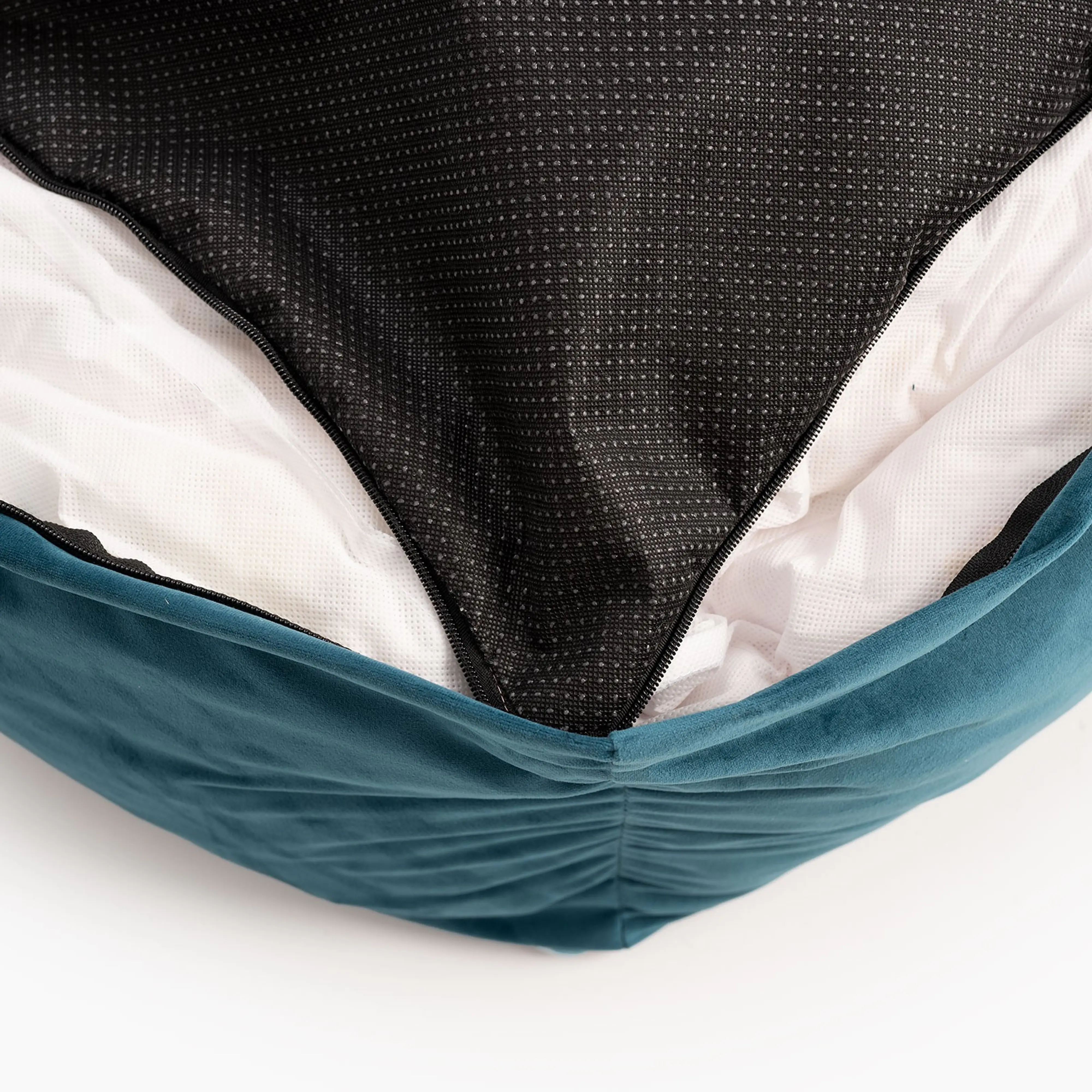 Legowisko zostało wykonane z materiału Magic Velvet (100% poliester), gramatura 300g. Jest to bardzo wytrzymała, odporna na ścieranie tkanina, która posiada certyfikat odporności na zwierzaki. Tkanina wyprodukowana w technologii Cleanaboo - ogranicza wchłanianie wody - rozlany płyn formuje się w krople i nie wnika do wnętrza tkaniny.