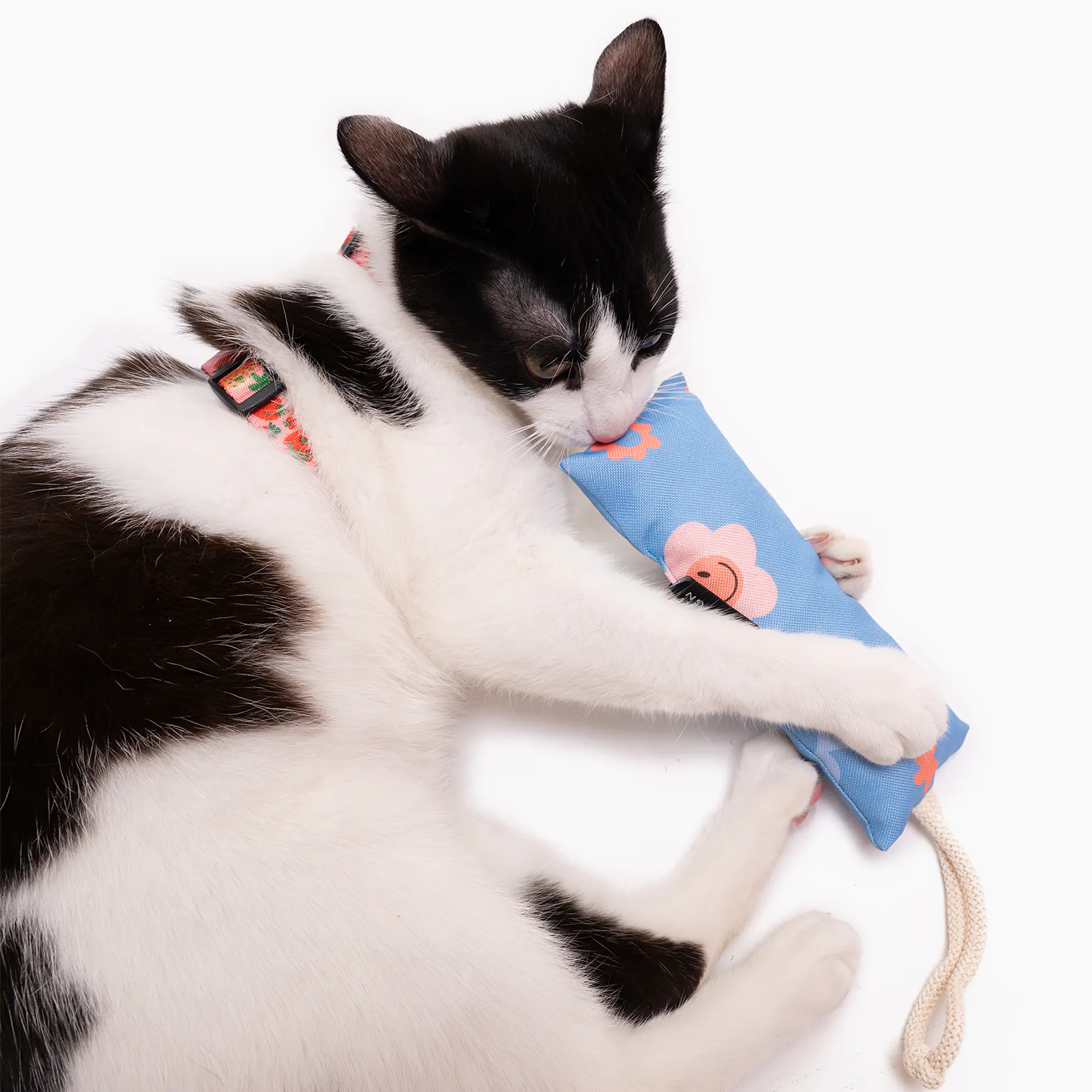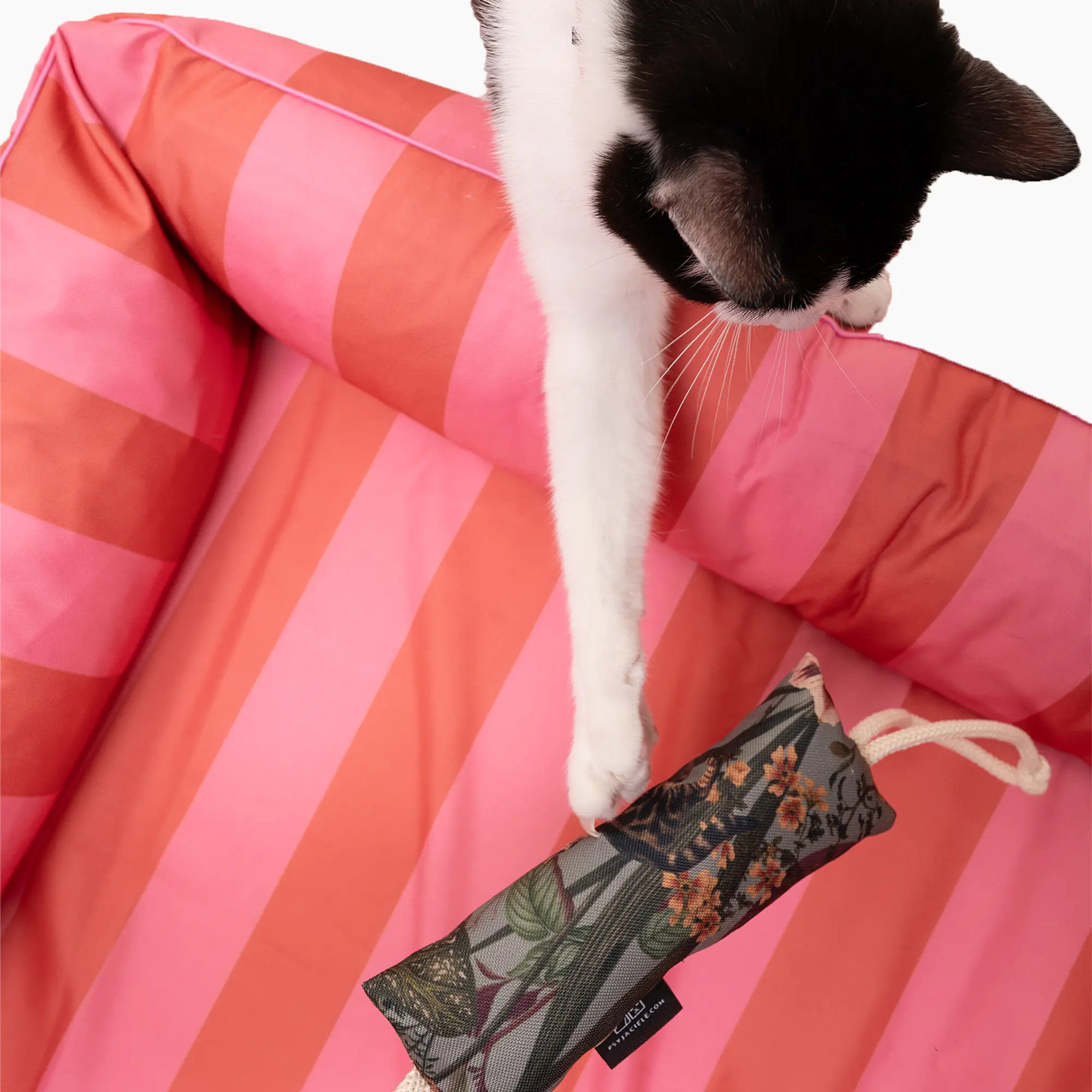 Kopacz uszyty jest z mocnego, wodoodpornego materiału z jednym z naszych wzorów; w środku wypełniony został miękką owatą oraz w zależności od opcji, którą wybierzecie, kocimiętką lub walerianą.