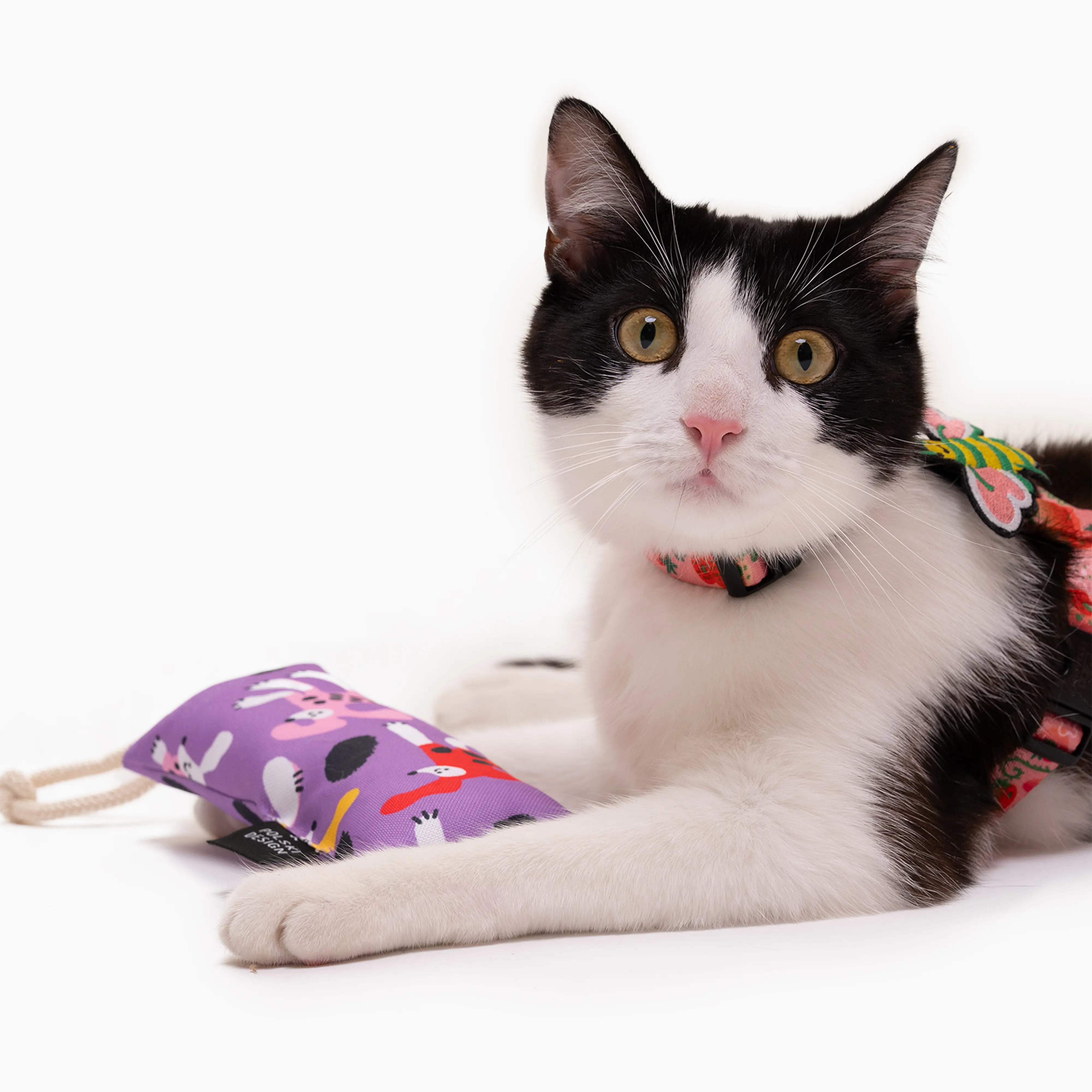 Kopacz uszyty jest z mocnego, wodoodpornego materiału z jednym z naszych wzorów; w środku wypełniony został miękką owatą oraz w zależności od opcji, którą wybierzecie, kocimiętką lub walerianą.
