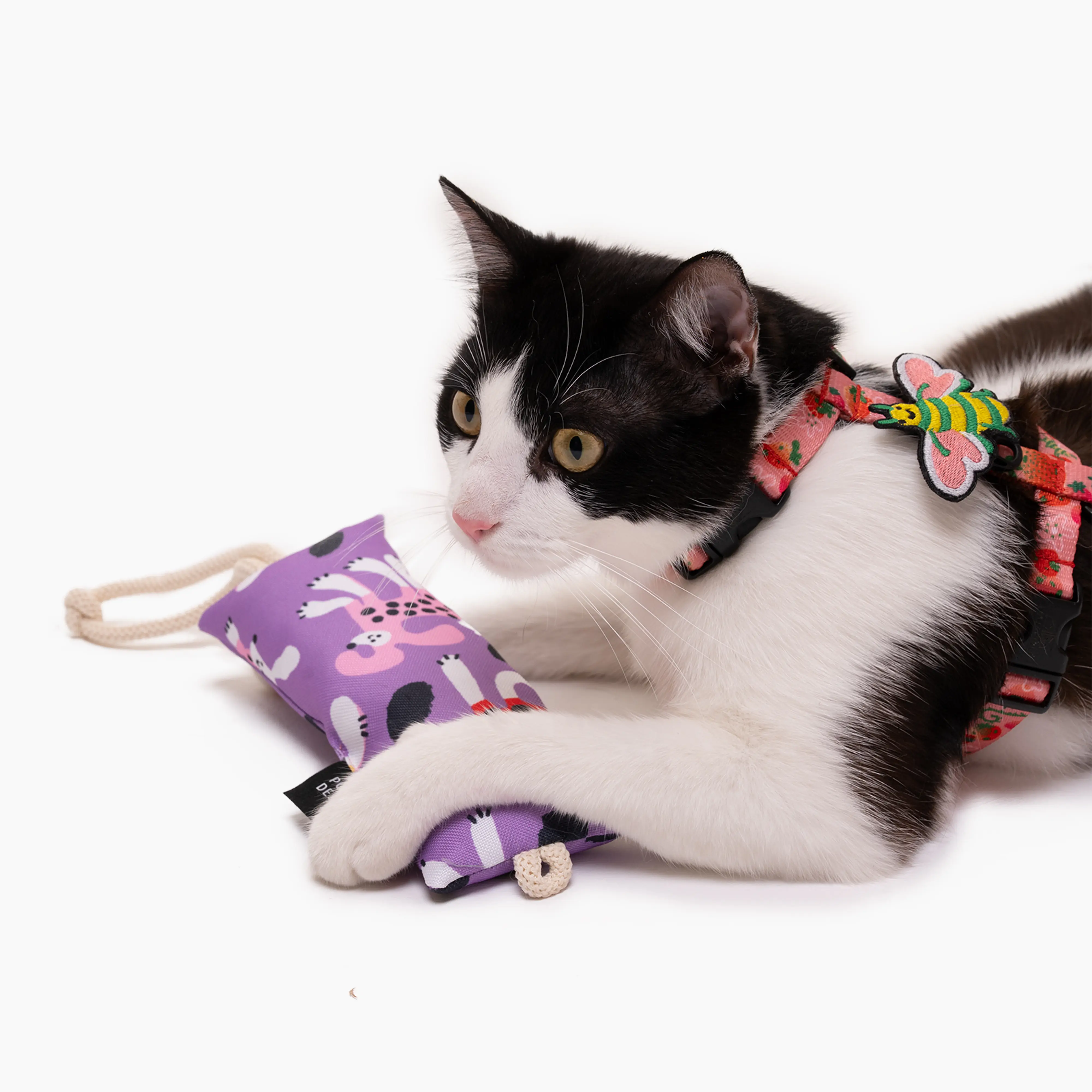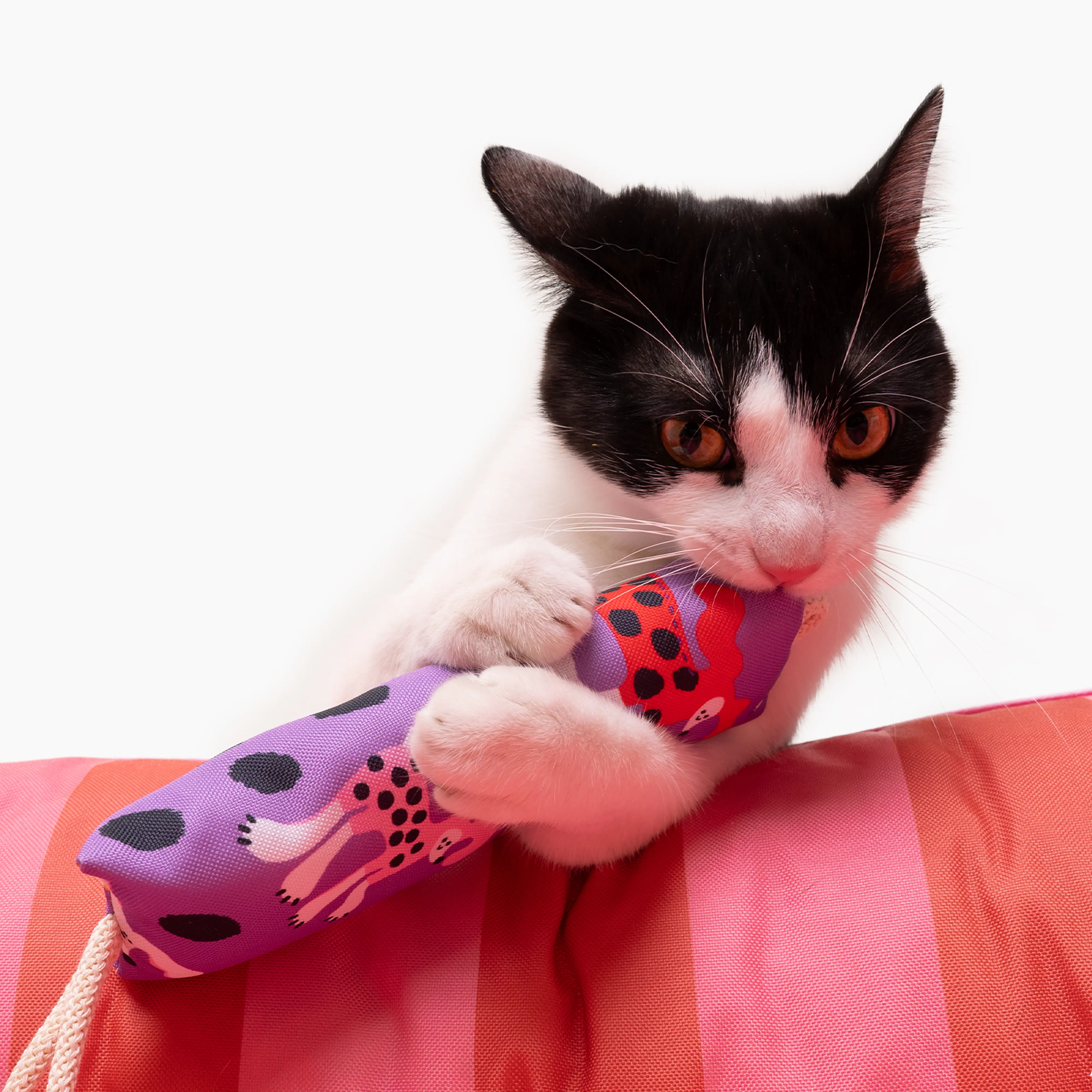 Kopacz uszyty jest z mocnego, wodoodpornego materiału z jednym z naszych wzorów; w środku wypełniony został miękką owatą oraz w zależności od opcji, którą wybierzecie, kocimiętką lub walerianą.
