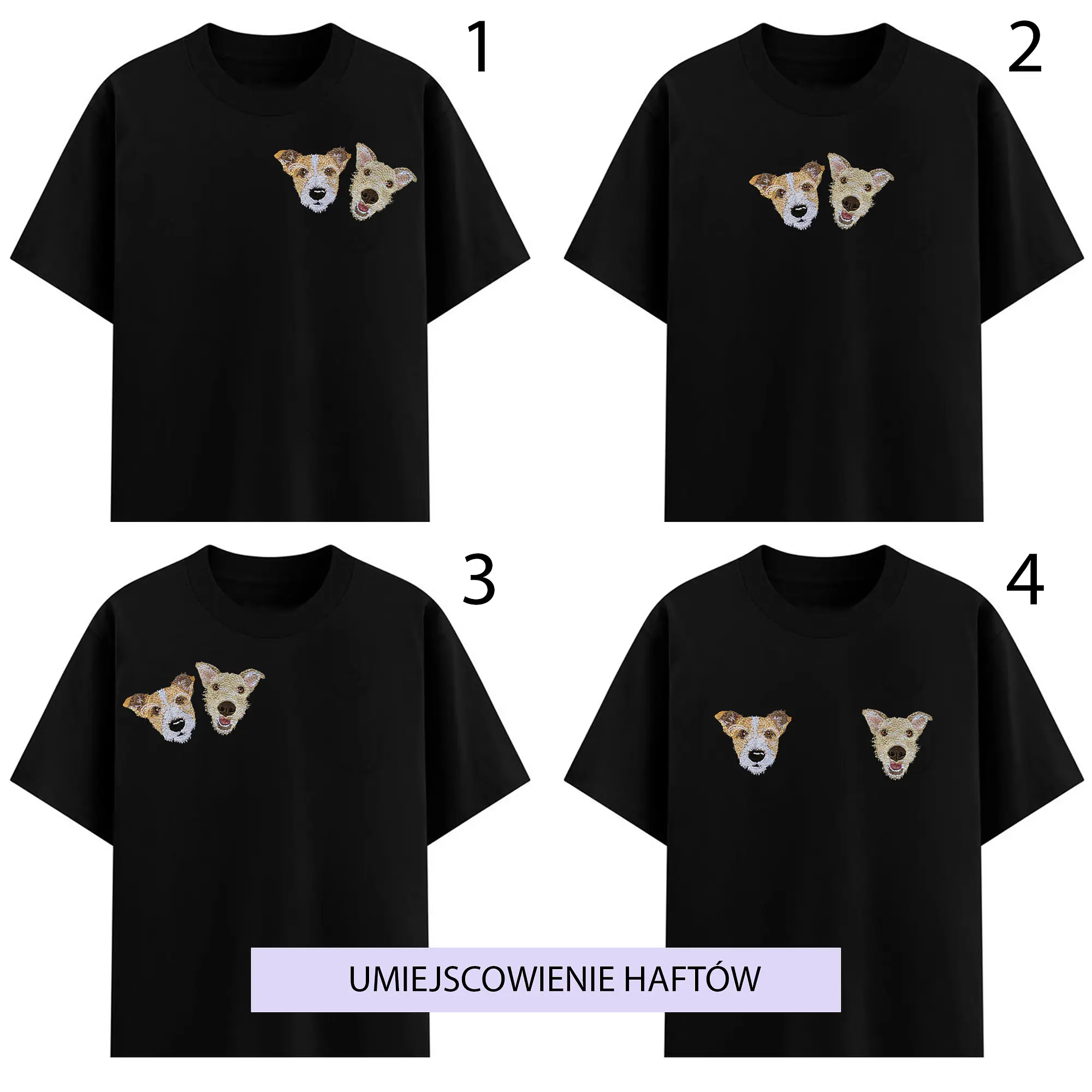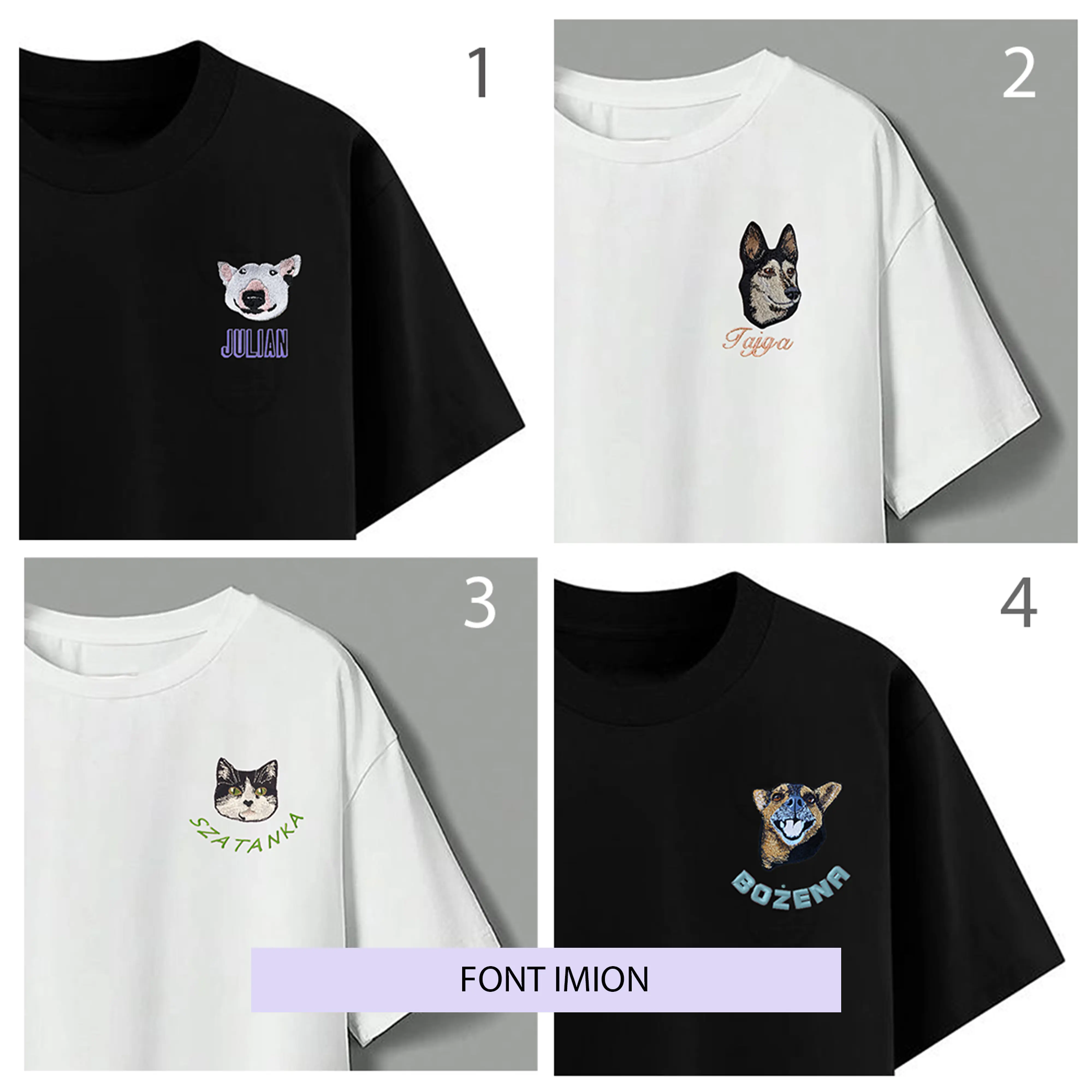 *Jeśli nie wybierzesz fontu do podpisu to imię zwierzaka napiszemy fontem nr 3. Haft ma wielkość około 8 cm.