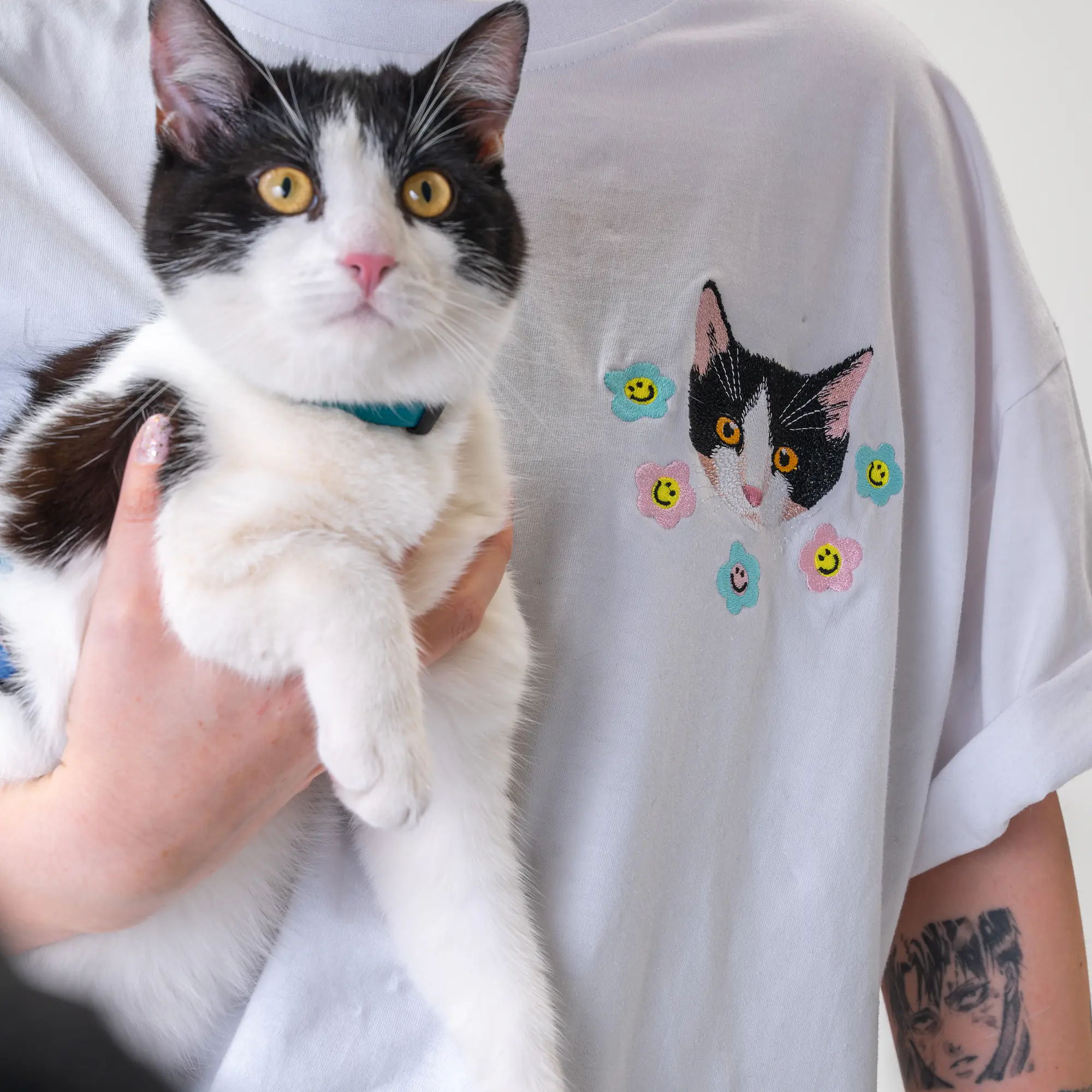 Biały t-shirt z personalizowanym haftem to must-have dla każdego, kto chce mieć coś naprawdę unikalnego. Na koszulce widnieje haft przedstawiający Twojego psa lub kota, stworzony na podstawie przesłanego zdjęcia. Koszulka jest mega wygodna, a haft wygląda naprawdę cool, więc świetnie sprawdzi się na co dzień, a także jako oryginalny prezent dla każdego fana zwierzaków.