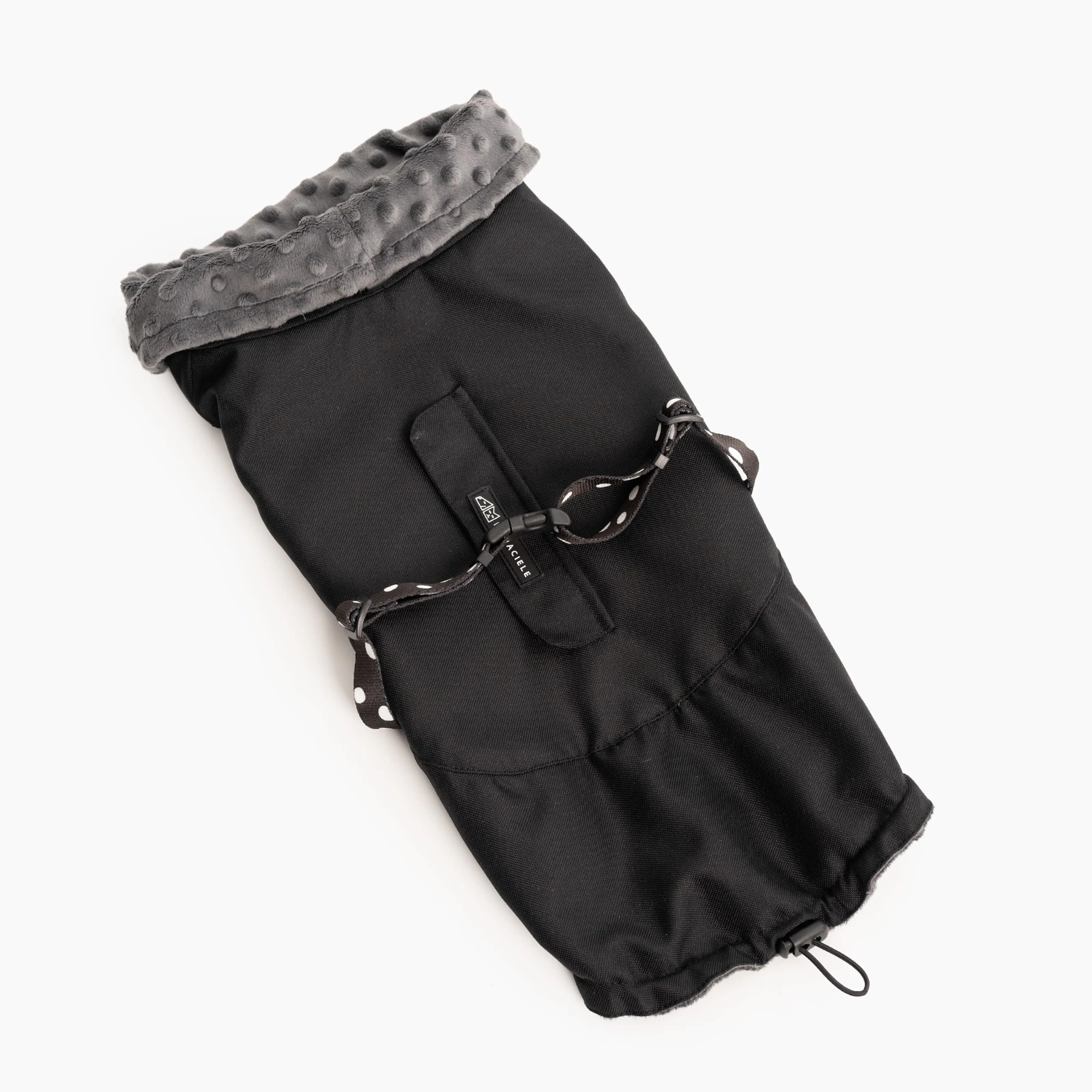 Kurtka wykonana została z wodoodpornej tkaniny ze wzorem odpornej na wiatr. Materiał jest wodoodporny, ale nie wodoszczelny, kurtka jest przeznaczona na chłody i mrozy, a nie na deszcz. Wnętrze kurtki to mięciutki polar zapewniający ciepełko nawet największemu zmarzlakowi. Kurtka zapinana jest na klamrę z regulacją, dzięki czemu można ją idealnie dopasować do psa. Klamra po zapięciu powinna być przesunięta za klapkę z otworem, by pasek się nie przesuwał i przytrzymywał tył kurtki. Użyliśmy bardzo mocnej, smyczowej taśmy w pasującym wzorze. Kurtka posiada duży kołnierz, który może w pełni chronić szyje psa lub zostać odgięty, a wszyty ściągacz pozwala ją spiąć zabezpieczając psa przed śniegiem czy wiatrem. Na wierzchu umieściliśmy pionową dziurkę pozwalająca zapiąć szelki niezależnie od miejsca w którym znajdują się na grzbiecie. Dziurka ma dodatkową nakładkę zabezpieczającą przed dostawaniem się zimna. Cała część za łapkami kurtki ma wbudowany ściągacz ze stoperem pozwalający idealnie dopasować kurtkę do psa. Zadbaliśmy również o aktywne pieski poprzez wszycie miękkich ściągaczy przy otworach na łapy, które w pełni zabezpieczą psa przed otarciami. Część spodnia natomiast została podkrojona w taki sposób aby uniknąć kontaktu kurtki z siuśkami :)