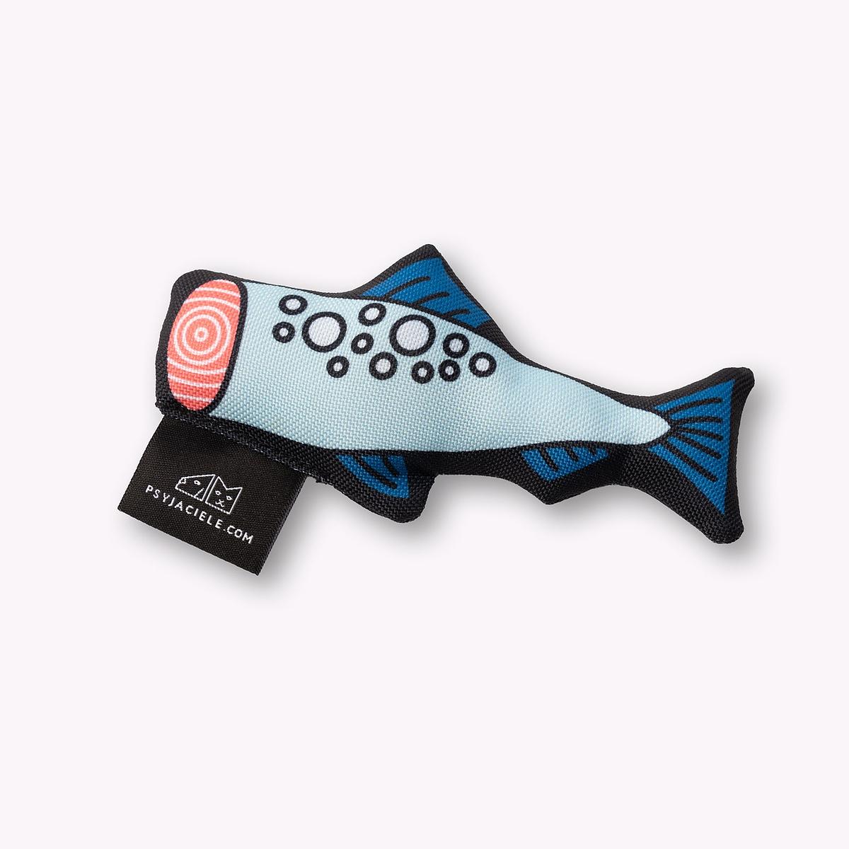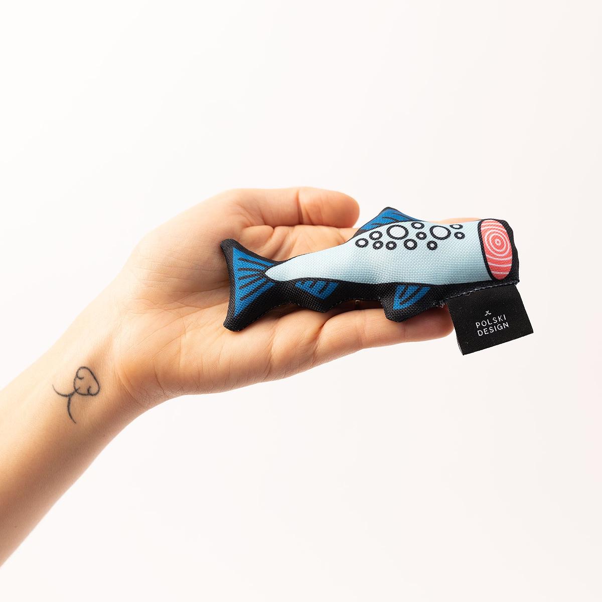 Nasza zabawka w kształcie ryby sprawi radość każdemu kociakowi. Zabawka uszyta jest z mocnego, wodoodpornego materiału; w środku wypełniona została miękką owatą oraz odrobiną kocimiętki, za którą szaleją wszystkie kociaki. Ciekawy wzór zaprojektowany przez wspaniałą ilustratorkę Adelę Madej sprawi, że każdy pupil będzie zadowolony z takiego prezentu