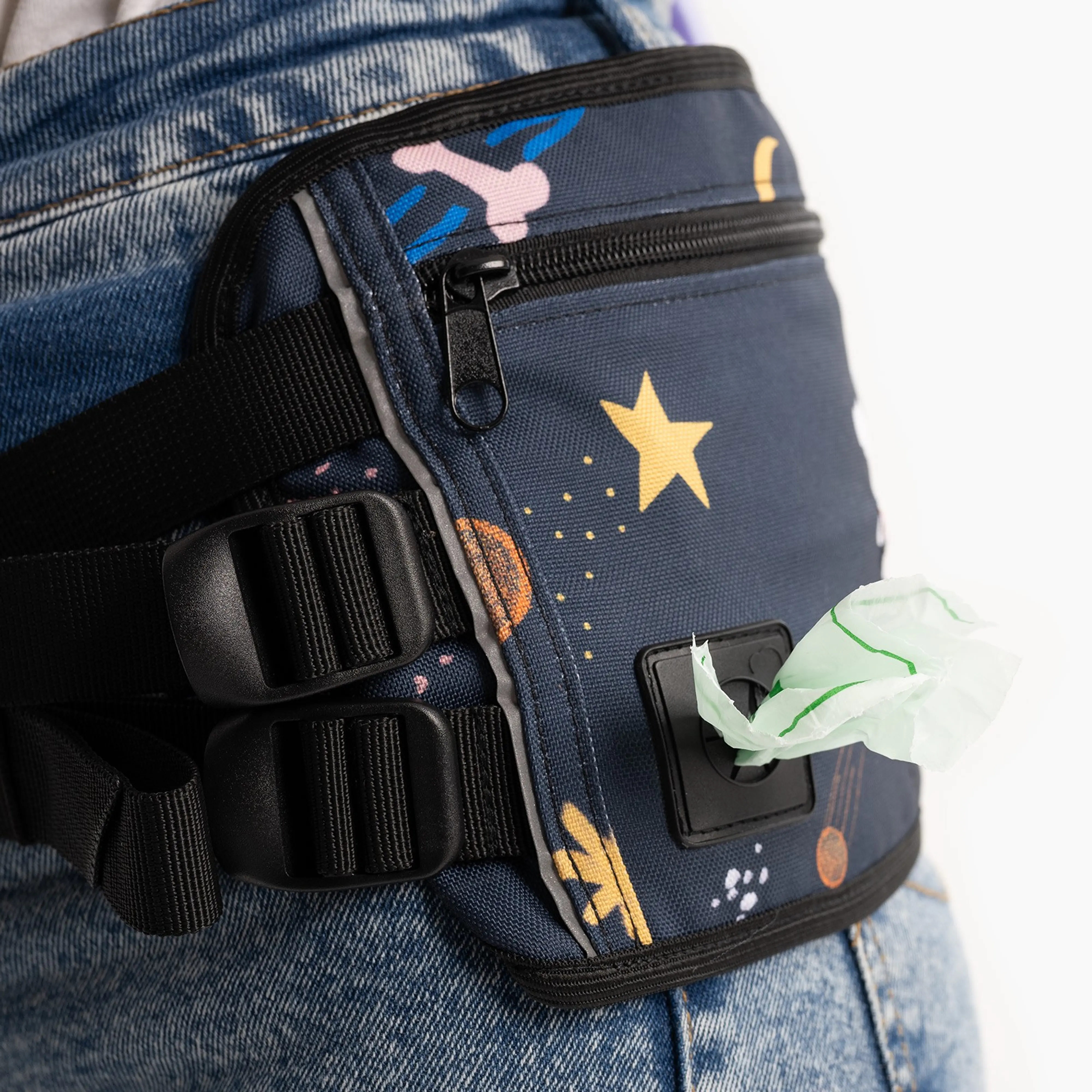 Pas to super produkt, który ma wbudowaną kieszeń na smaczki zabezpieczoną tkaniną tłuszczodporną, kieszeń inne drobiazgi typu telefon, klucz z wydzieloną przestrzenią na kupoworki oraz koszyk na butelkę z wodą.