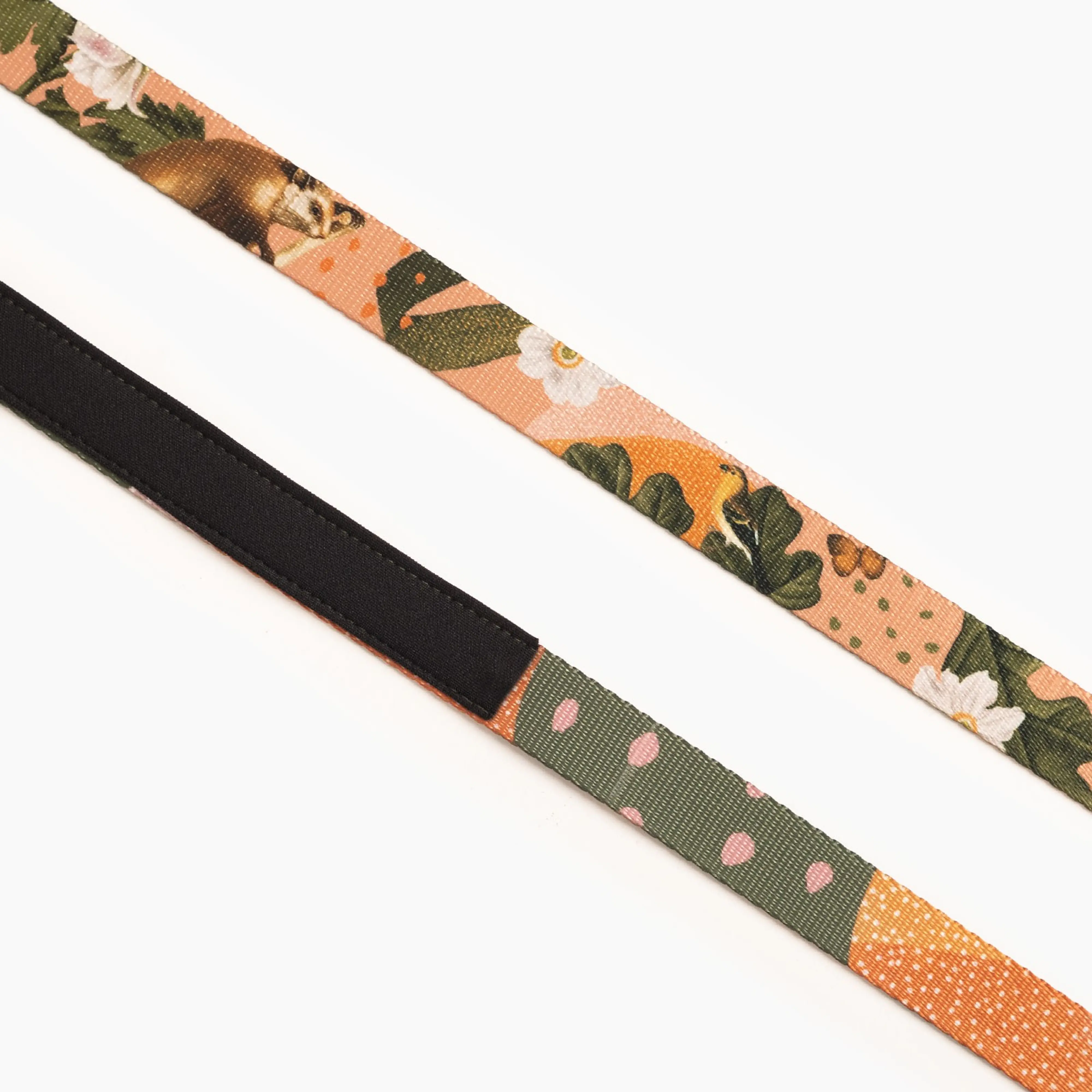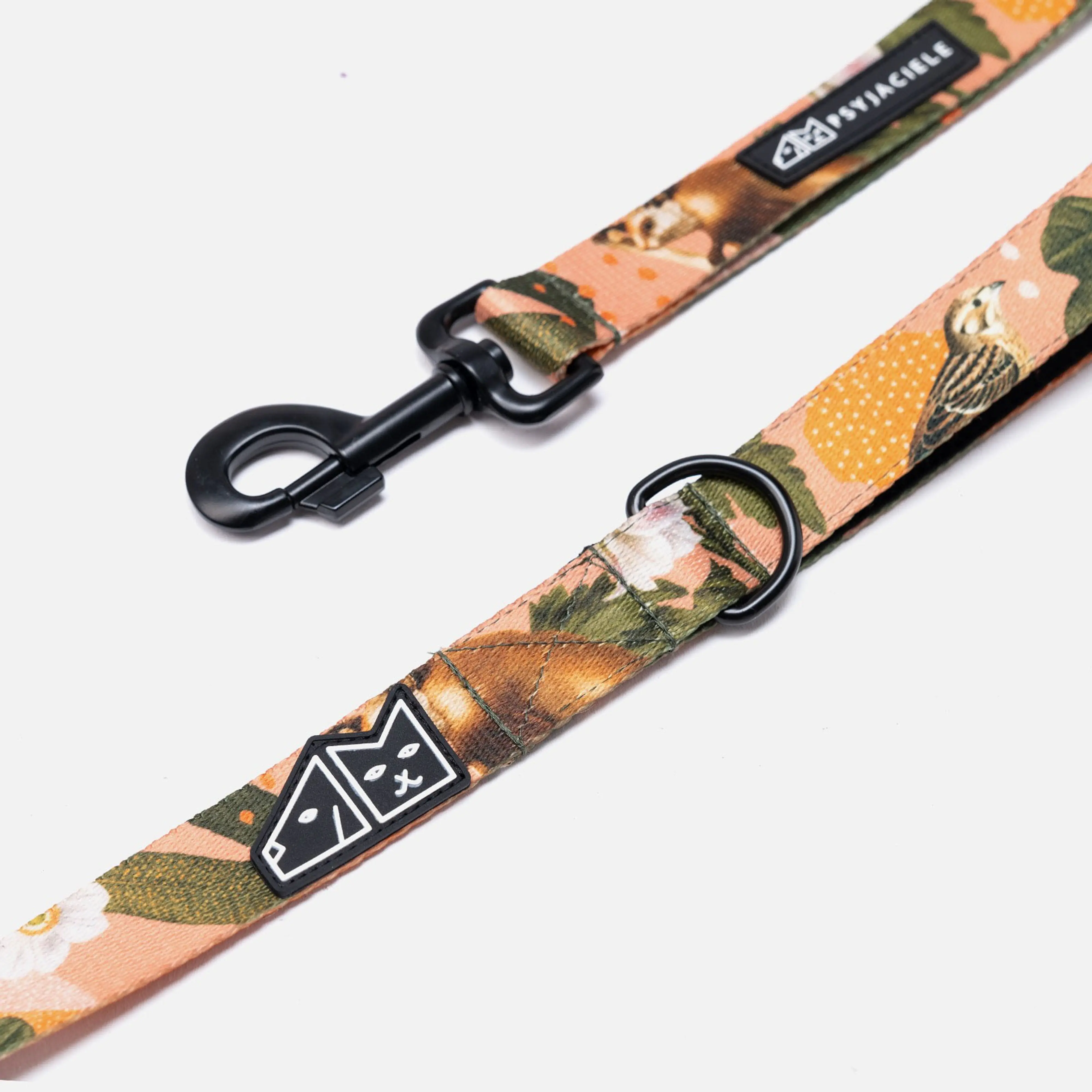 Key product features: Colorful, double-sided, very durable tape 25mm wide; Strong Duraflex fittings resistant to weather conditions. Two types of snap hooks adapted to the size of the dog; D ring to fasten the bag to the back of the bag; Handmade in Poland; Handle lined with soft foam; An additional handle at the bottom of the leash; A unique design available only on Psyjaciele.com