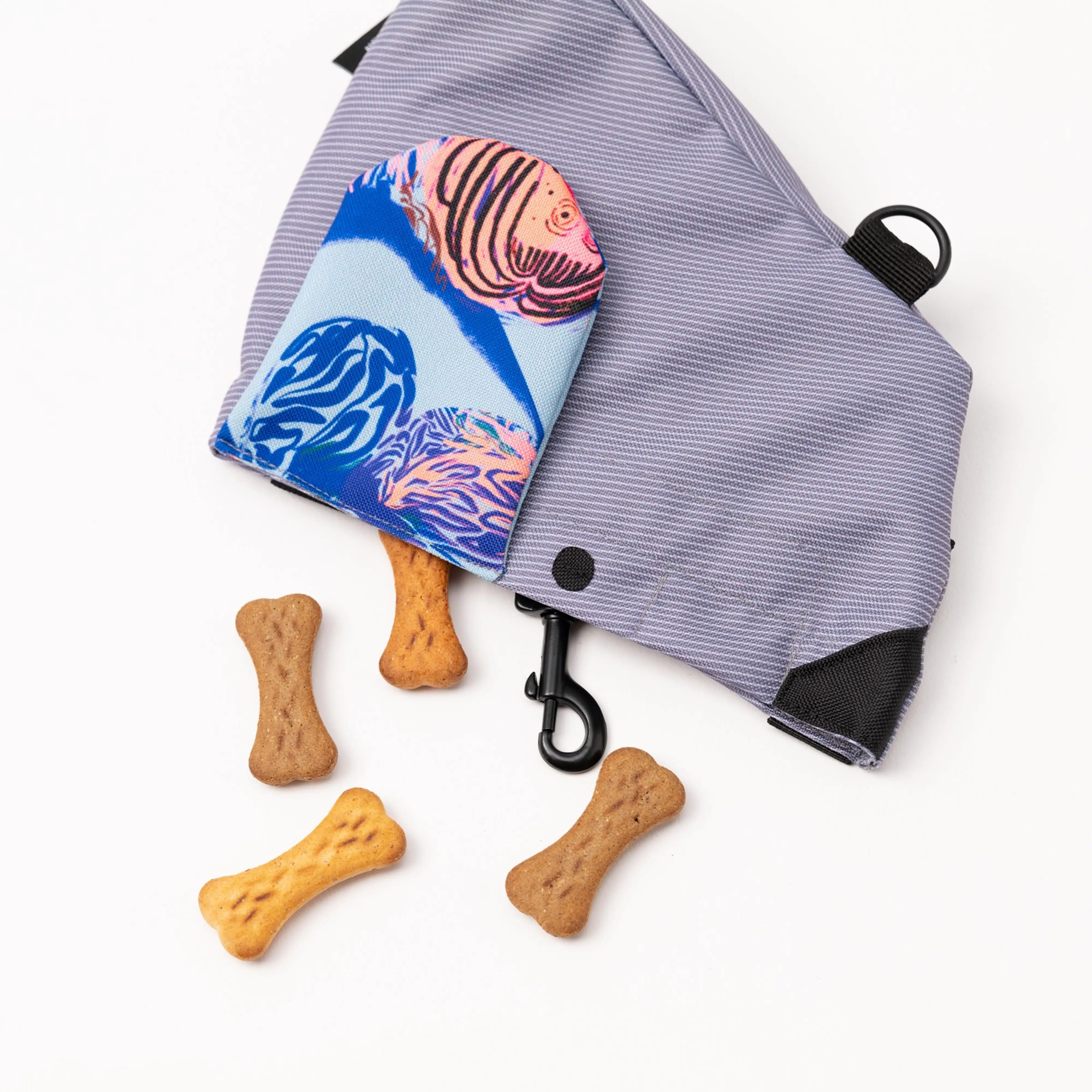 Nasza saszetka treningowa na smaczki to nie tylko wyjątkowy wygląd ale i duża funkcjonalność. Idealne uzupełnienie każdego spacerowego zestawu sprawdzi się dobrze dzięki dwóm rodzajom zastosowanego materiału. Na zewnątrz saszetki znajduje się wodoodporny materiał ze wzorem, wewnątrz natomiast jest mocowany na rzep wkład z gumowanego materiału odpornego na tłuszczyk z psich i kocich smaczków. Wkład można odczepić po każdym spacerze i przemyć wilgotną ściereczką, a po wielokrotnym użyciu wymienić na nowy.