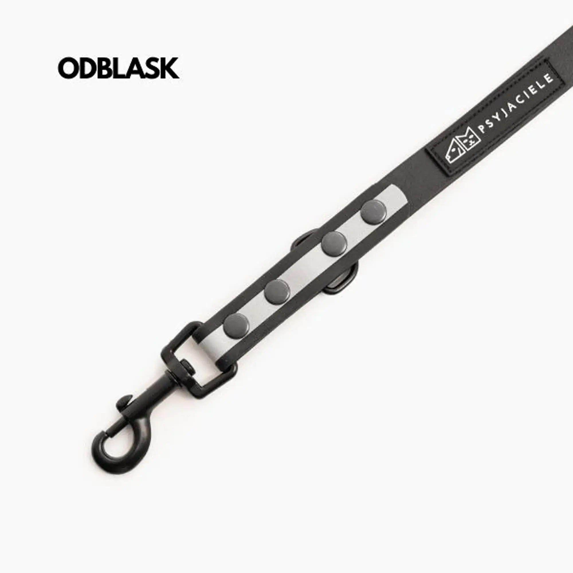 Odblask w smyczy możemy dodać tylko na taśmę szerokości 19mm. Odblask jest dodawany tylko na końcu smyczy i jest to kawałek czarnej taśmy z odblaskowym paskiem na środku.