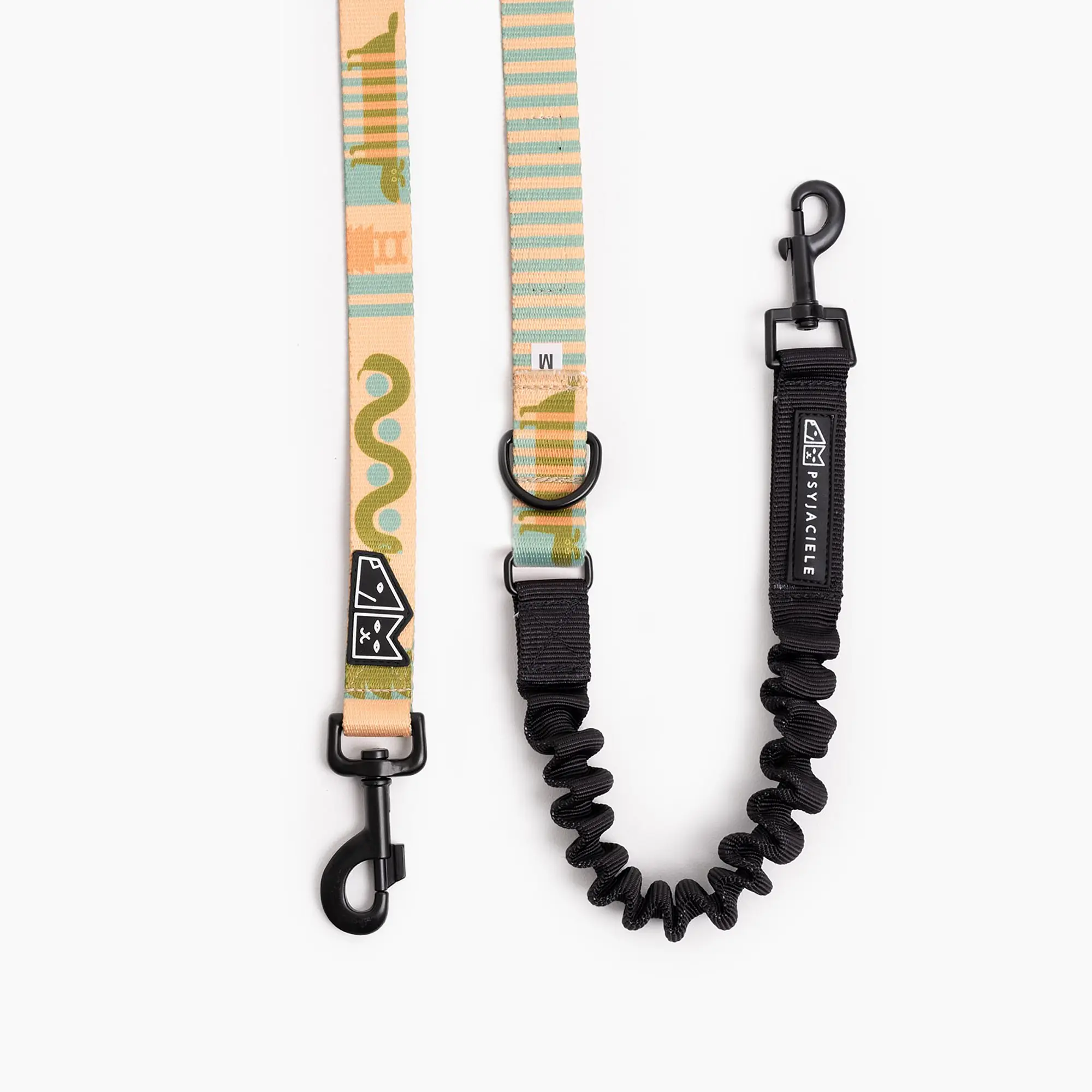Świetny, unikalny design smyczy sprawi, iż Twój psiak będzie wyglądał jak prawdziwy model :). Smycz przepinana z amortyzatoremto świetne psie akcesorium przydatne szczególnie dla psów ciągnących na smyczy. Smycz posiada dwa wytrzymałe karabinki pozwalające na regulację długości. Amortyzator redukuje silę napięcia odczuwalną zarówno dla psa jak i właściciela. Smycz została uszyta ręcznie z bardzo wytrzymałej dwustronnej taśmy. Czarne, mocne, matowe okucia marki Duraflex i super wytrzymały karabinek gwarantują długotrwałe użytkowanie. Do wyboru 2 wielkości karabinków mniejszy (lżejszy) oraz większy (cięższy) pozwalający dobrać smycz do wagi psa. Smycz posiada 3 miejsca zapięcia karabinków dając nam możliwość korzystania z pełnej długości, stworzenia rączki, skrócenia smyczy o 1/3 lub 1/2.