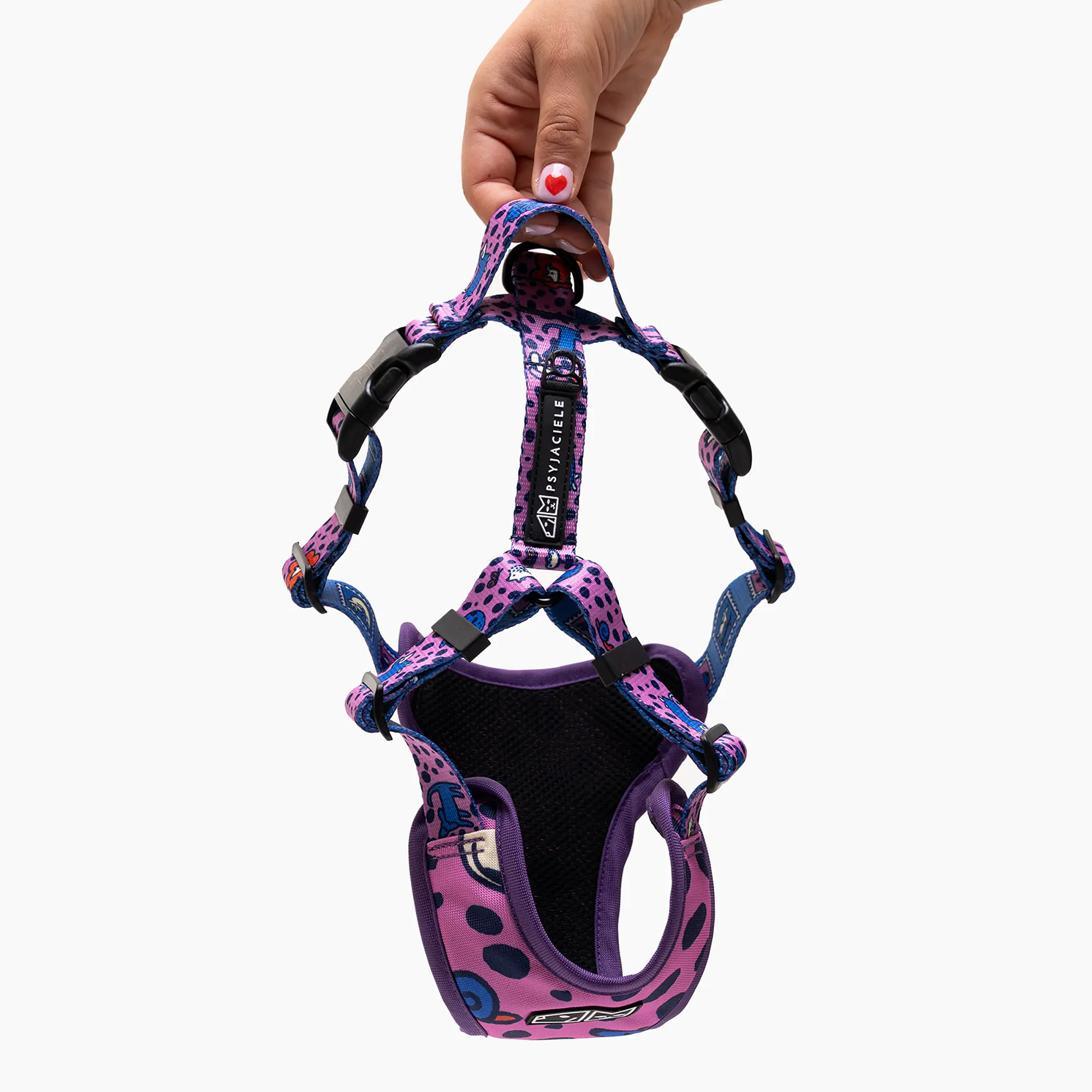 Szelki bezuciskowe Psyjaciele.com pozwalają na regulacje obwodu szyjnego i klatki piersiowej pozwalając na idealne dopasowanie do sylwetki psa.