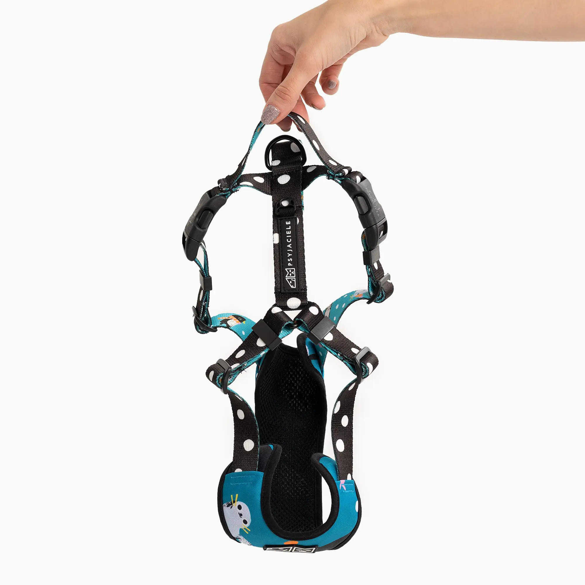 Szelki bezuciskowe Psyjaciele.com pozwalają na regulacje obwodu szyjnego i klatki piersiowej pozwalając na idealne dopasowanie do sylwetki psa.