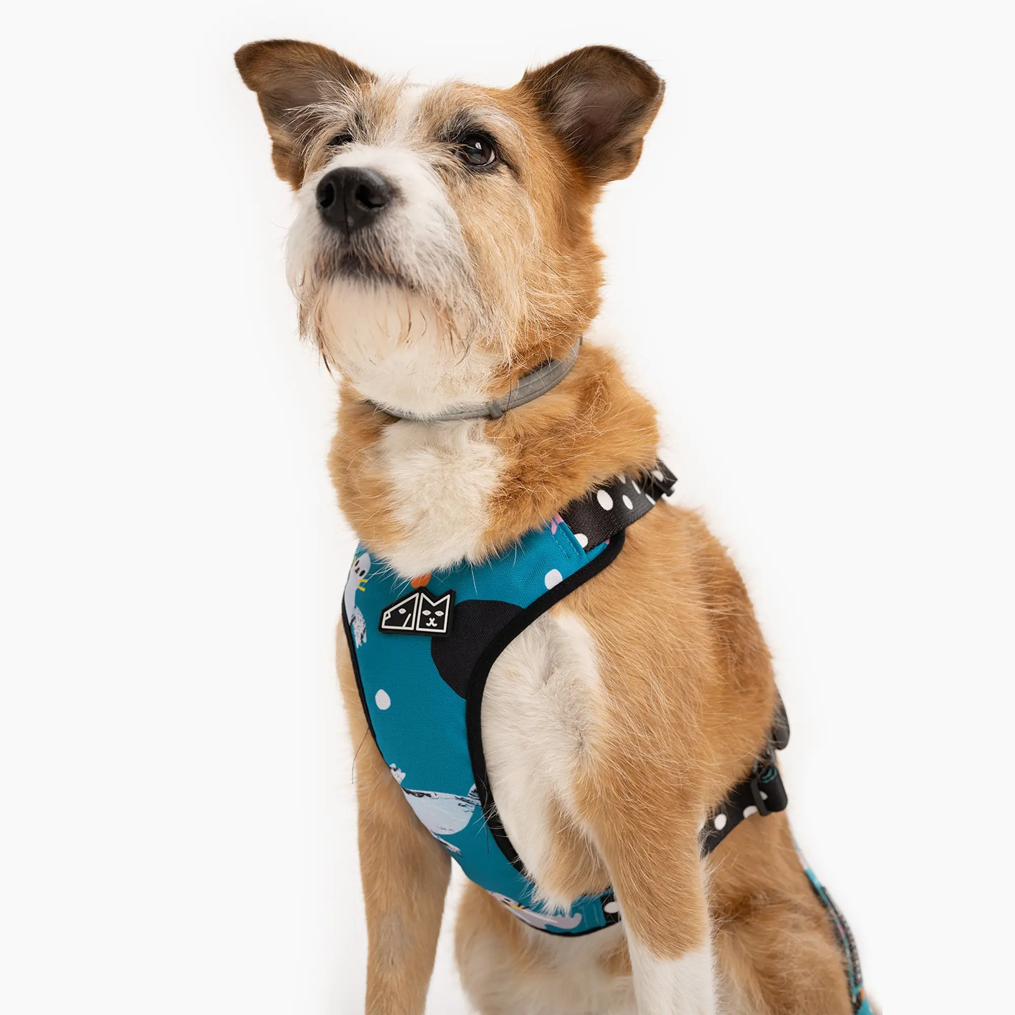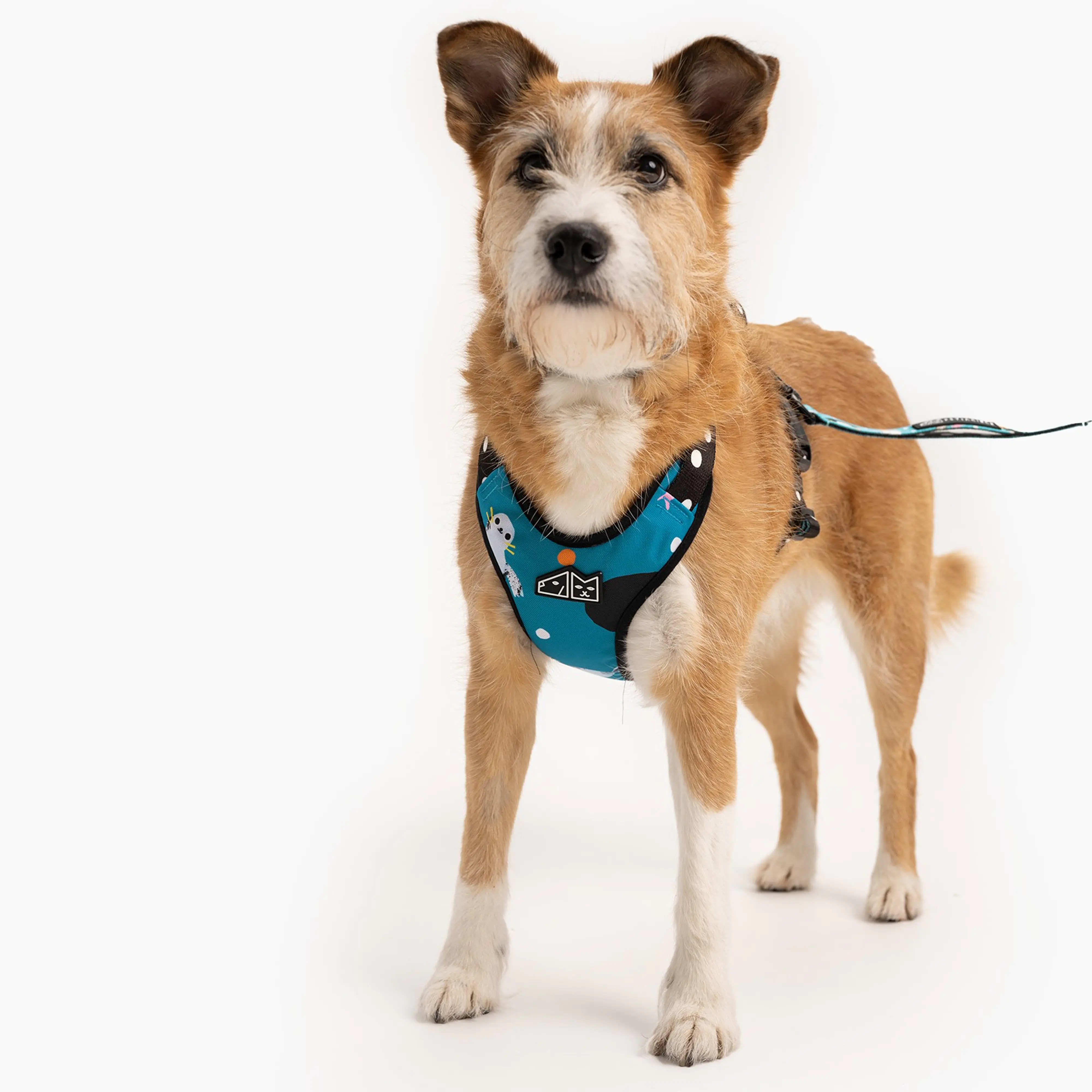 Świetny, unikalny design szelek sprawi, iż Twój psiak będzie wyglądał jak prawdziwy model :). Szelki bezuciskowe to jedne z najwygodniejszych psich akcesoriów - dzięki specjalnej konstrukcji rozkładają naprężenie w sposób nie obciążający kręgosłupa, a oddalenie od psich pach gwarantuje, że nie powstaną obtarcia. Nasze szelki uszyte zostały ręcznie z bardzo wytrzymałej dwustronnej taśmy o szerokości 25mm lub 20mm. Czarne, mocne, matowe okucia i klamra marki Duraflex gwarantują długotrwałe użytkowanie, a zastosowana w aż 4 miejscach regulacja zapewnia świetne dopasowanie do każdego psiaka. Dół szelek to połączenie dwóch tkanin - wodoodporna tkanina ze wzorem odporna na zabrudzenia, a od środka mięciutka, lekka pianka dystansowa przepuszczająca powietrze i zapobiegająca poceniu się psa lub kota. Całość została wykończona lamówką aby być super przyjemna dla psa. Dodatkowo na szczycie szelek dodaliśmy specjalny zaczep na adresówkę bądź numerek i wygodną rączkę, za którą można przytrzymać psa.