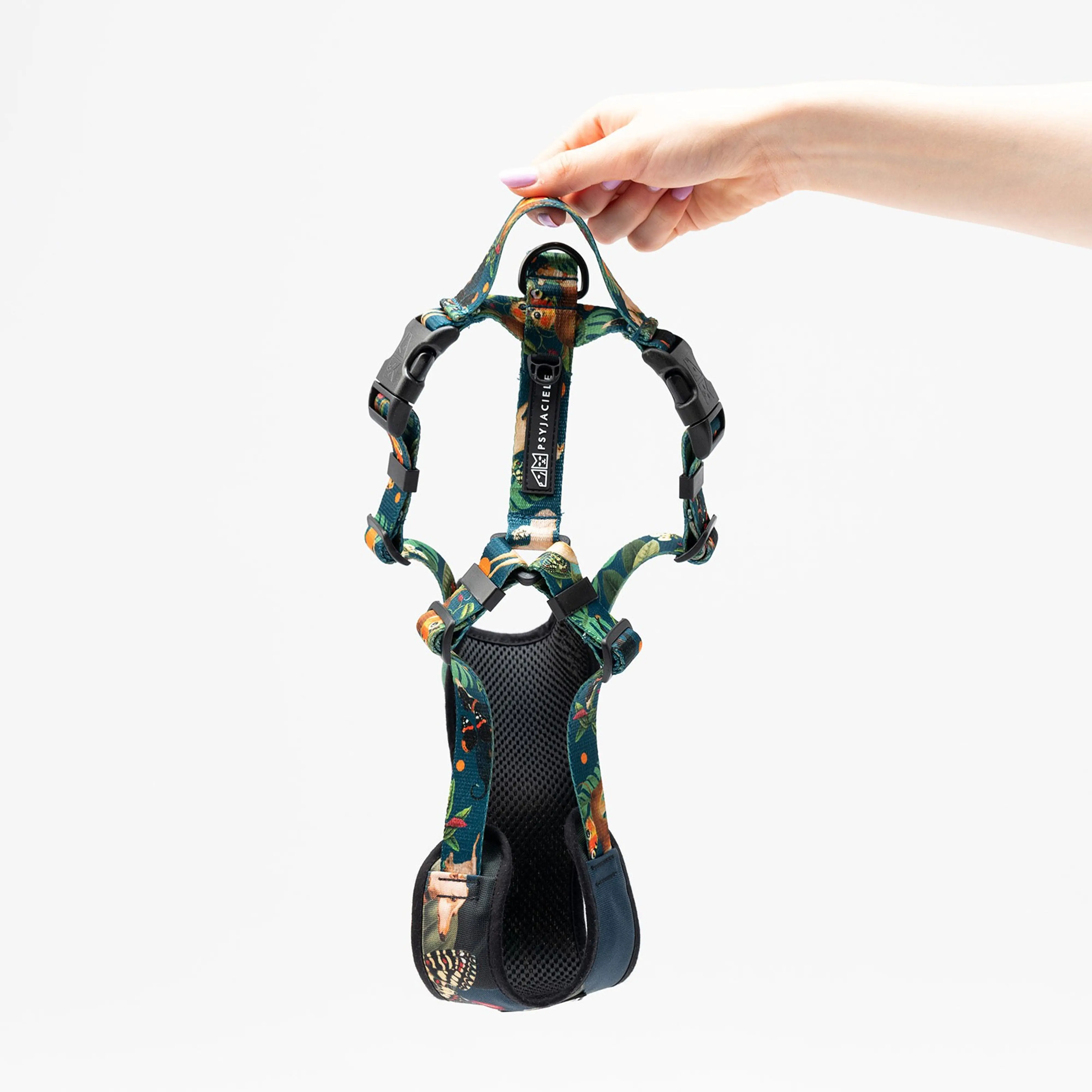 Świetny, unikalny design szelek sprawi, iż Twój psiak będzie wyglądał jak prawdziwy model :). Szelki bezuciskowe to jedne z najwygodniejszych psich akcesoriów - dzięki specjalnej konstrukcji rozkładają naprężenie w sposób nie obciążający kręgosłupa, a oddalenie od psich pach gwarantuje, że nie powstaną obtarcia. Nasze szelki uszyte zostały ręcznie z bardzo wytrzymałej dwustronnej taśmy o szerokości 25mm lub 20mm. Czarne, mocne, matowe okucia i klamra marki Duraflex gwarantują długotrwałe użytkowanie, a zastosowana w aż 4 miejscach regulacja zapewnia świetne dopasowanie do każdego psiaka. Dół szelek to połączenie dwóch tkanin - wodoodporna tkanina ze wzorem odporna na zabrudzenia, a od środka mięciutka, lekka pianka dystansowa przepuszczająca powietrze i zapobiegająca poceniu się psa lub kota. Całość została wykończona lamówką aby być super przyjemna dla psa. Dodatkowo na szczycie szelek dodaliśmy specjalny zaczep na adresówkę bądź numerek i wygodną rączkę, za którą można przytrzymać psa.