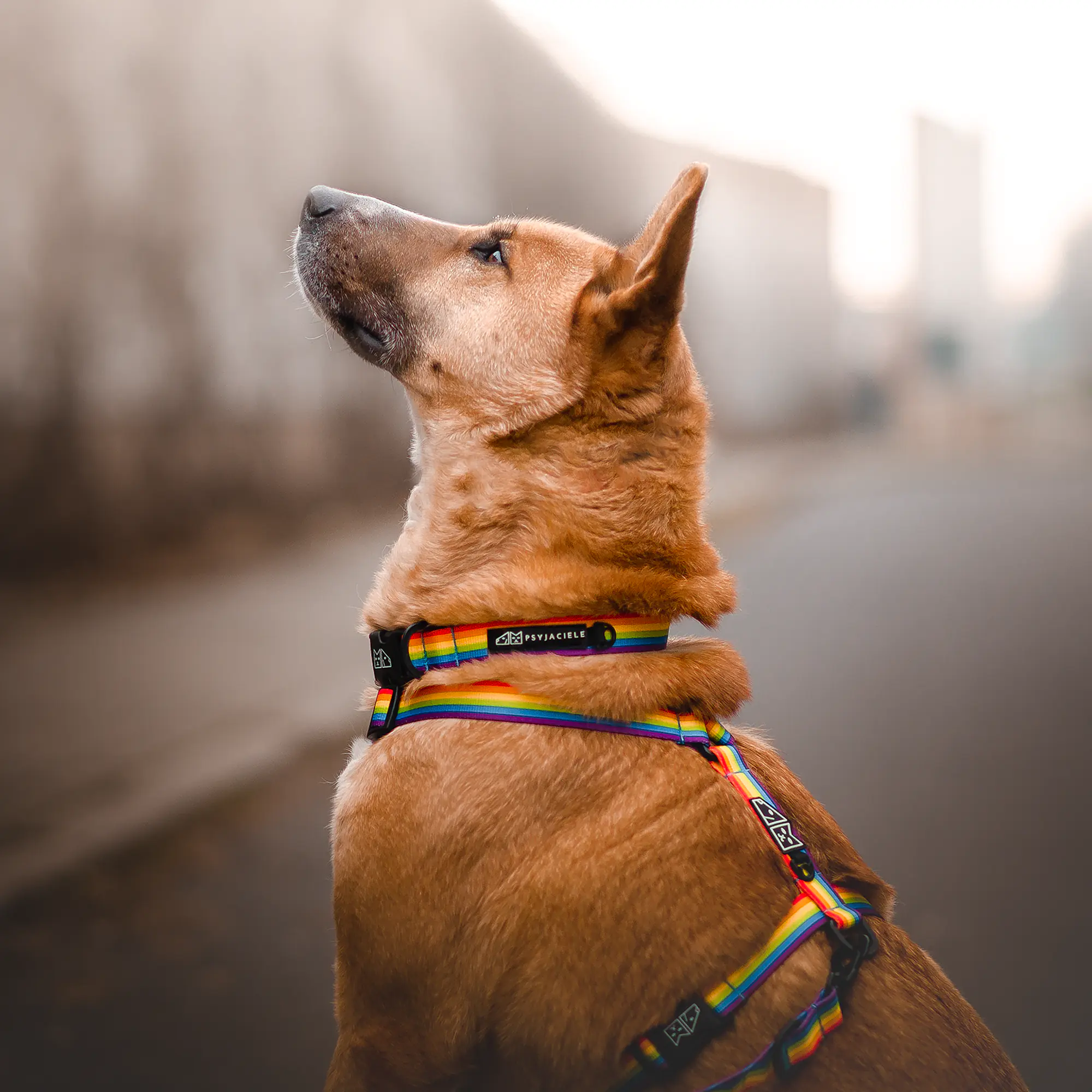 Wzór Miłość, równość, gryzaki - zwany przez nas wewnętrznie również "Psy nie widzą tylu kolorów:)" to piękny design połączony z pięknymi przekonaniami. Jest to tęcza miłości, którą okazują psy wszystkim swoim właścicielom każdego dnia. Cudowne połączenie kolorów przepięknie skomponuje się z sierścią Twojego psiaka! Ubierz swojego psiaka w designerski wzór, a każdy spacer będzie super psyjemny. Do szelek możesz dopasować smycz zwykła lub przepinaną oraz etui na kupoworki.