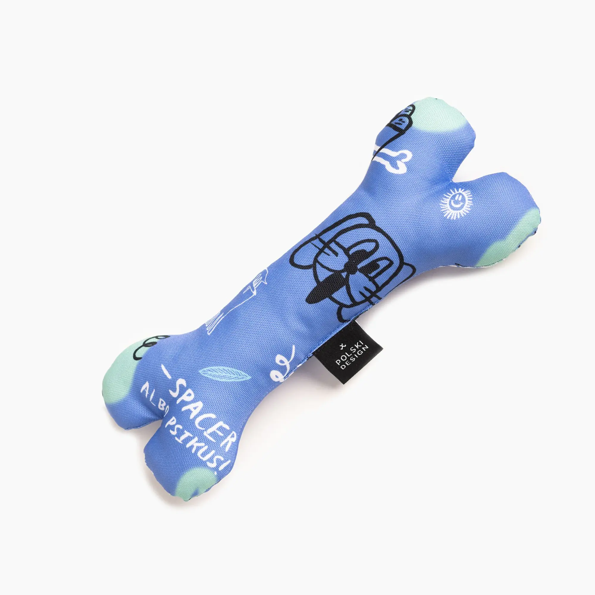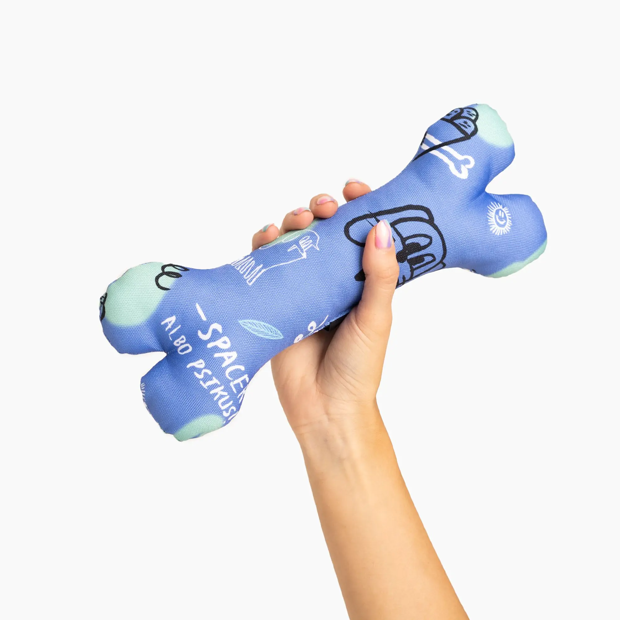 Nasza zabawka w kształcie kości sprawi radość każdemu psiakowi. Kość uszyta jest z mocnego, wodoodpornego materiału; w środku wypełniona została miękką owatą. Ciekawy wzór zaprojektowany przez wspaniałą Aleksandrę Morawiak sprawi, że każdy pupil będzie zadowolony z takiego prezentu