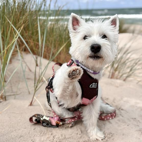 Świetny, unikalny design szelek sprawi, iż Twój psiak będzie wyglądał jak prawdziwy model :). Szelki bezuciskowe to jedne z najwygodniejszych psich akcesoriów - dzięki specjalnej konstrukcji rozkładają naprężenie w sposób nie obciążający kręgosłupa, a oddalenie od psich pach gwarantuje, że nie powstaną obtarcia. Nasze szelki uszyte zostały ręcznie z bardzo wytrzymałej dwustronnej taśmy o szerokości 25mm lub 20mm. Czarne, mocne, matowe okucia i klamra marki Duraflex gwarantują długotrwałe użytkowanie, a zastosowana w aż 4 miejscach regulacja zapewnia świetne dopasowanie do każdego psiaka. Dół szelek to połączenie dwóch tkanin - wodoodporna tkanina ze wzorem odporna na zabrudzenia, a od środka mięciutka, lekka pianka dystansowa przepuszczająca powietrze i zapobiegająca poceniu się psa lub kota. Całość została wykończona lamówką aby być super przyjemna dla psa. Dodatkowo na szczycie szelek dodaliśmy specjalny zaczep na adresówkę bądź numerek i wygodną rączkę, za którą można przytrzymać psa.