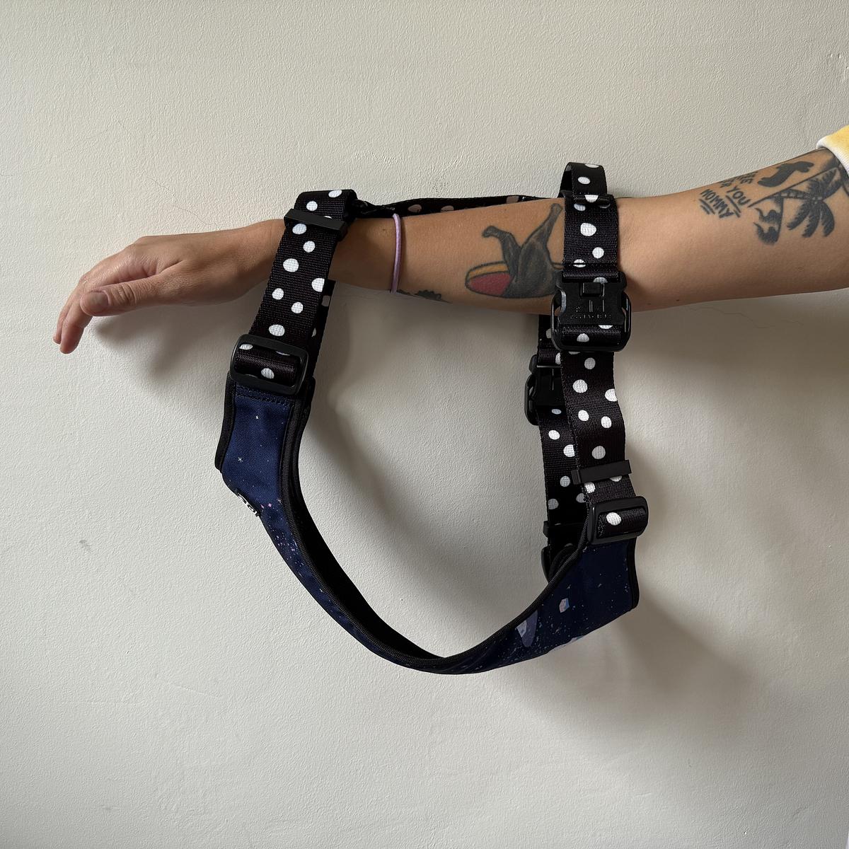 Świetny, unikalny design szelek sprawi, iż Twój psiak będzie wyglądał jak prawdziwy model :). Szelki bezuciskowe to jedne z najwygodniejszych psich akcesoriów - dzięki specjalnej konstrukcji rozkładają naprężenie w sposób nie obciążający kręgosłupa, a oddalenie od psich pach gwarantuje, że nie powstaną obtarcia. Nasze szelki uszyte zostały ręcznie z bardzo wytrzymałej dwustronnej taśmy o szerokości 25mm lub 20mm. Czarne, mocne, matowe okucia i klamra marki Duraflex gwarantują długotrwałe użytkowanie, a zastosowana w aż 4 miejscach regulacja zapewnia świetne dopasowanie do każdego psiaka. Dół szelek to połączenie dwóch tkanin - wodoodporna tkanina ze wzorem odporna na zabrudzenia, a od środka mięciutka, lekka pianka dystansowa przepuszczająca powietrze i zapobiegająca poceniu się psa lub kota. Całość została wykończona lamówką aby być super przyjemna dla psa. Dodatkowo na szczycie szelek dodaliśmy specjalny zaczep na adresówkę bądź numerek i wygodną rączkę, za którą można przytrzymać psa.