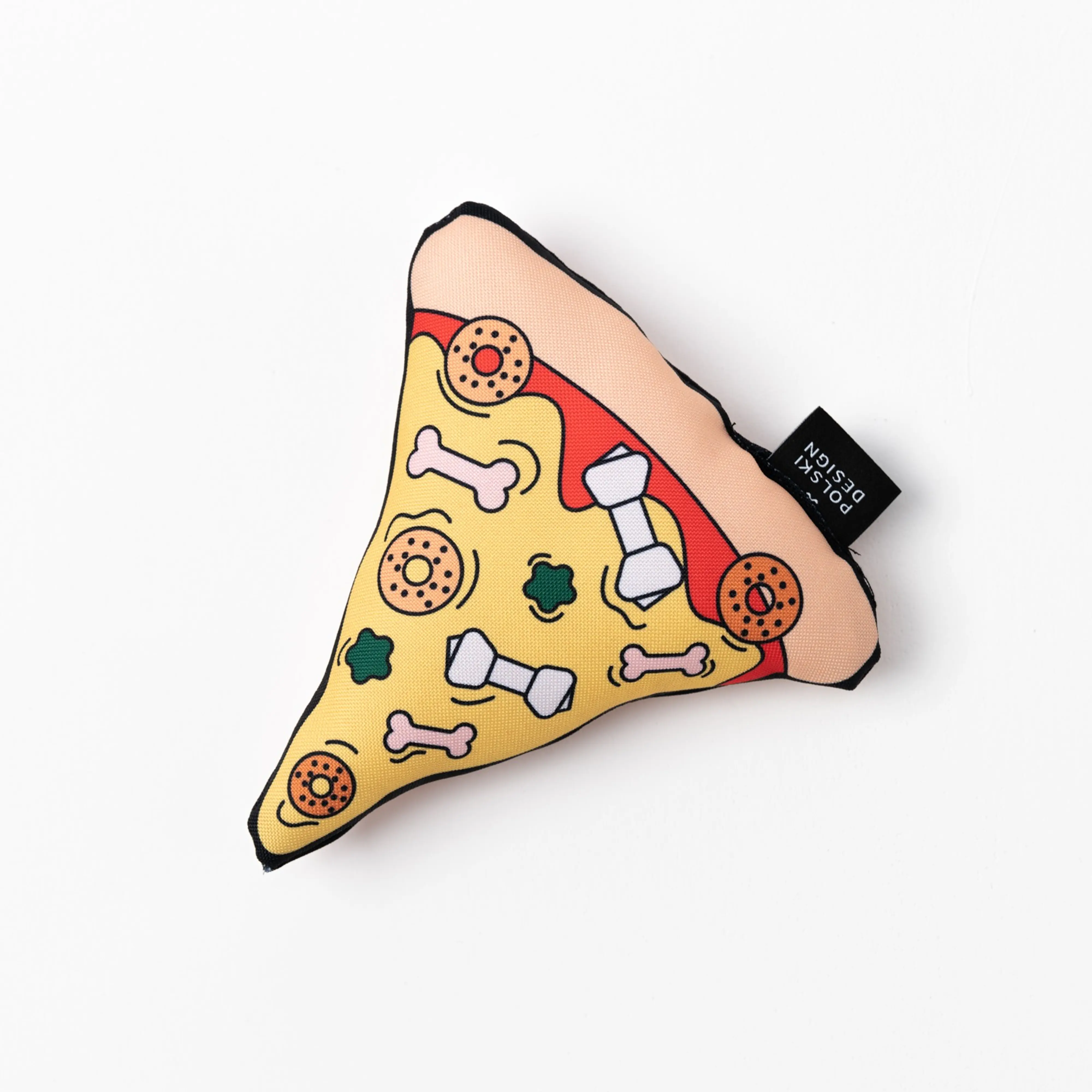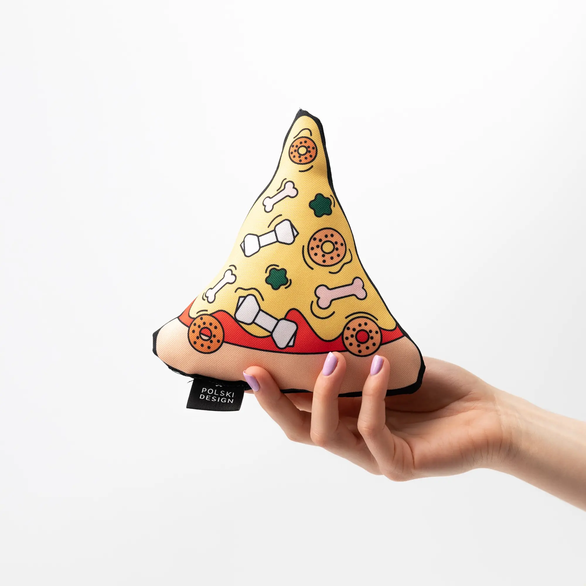Nasza zabawka w kształcie zabawnej pizzy sprawi radość każdemu psiakowi. Zabawka uszyta jest z mocnego, wodoodpornego materiału; w środku wypełniona została miękką owatą. Ciekawy wzór zaprojektowany przez wspaniałą ilustratorkę Adelę Madej sprawi, że każdy pupil będzie zadowolony z takiego prezentu