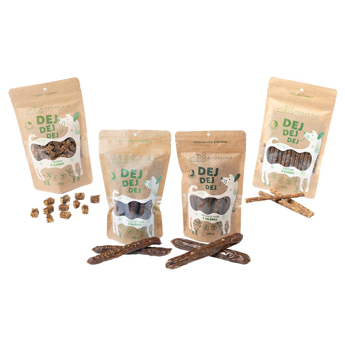 Zestaw przysmaków z dziczyzny to w 100% naturalna przekąska bez zbóż, sztucznych dodatków i zbędnych wypełniaczy.